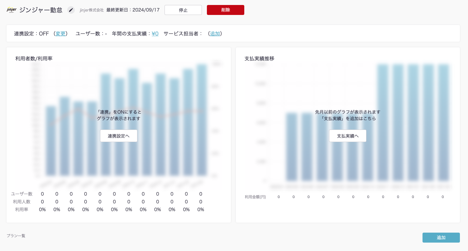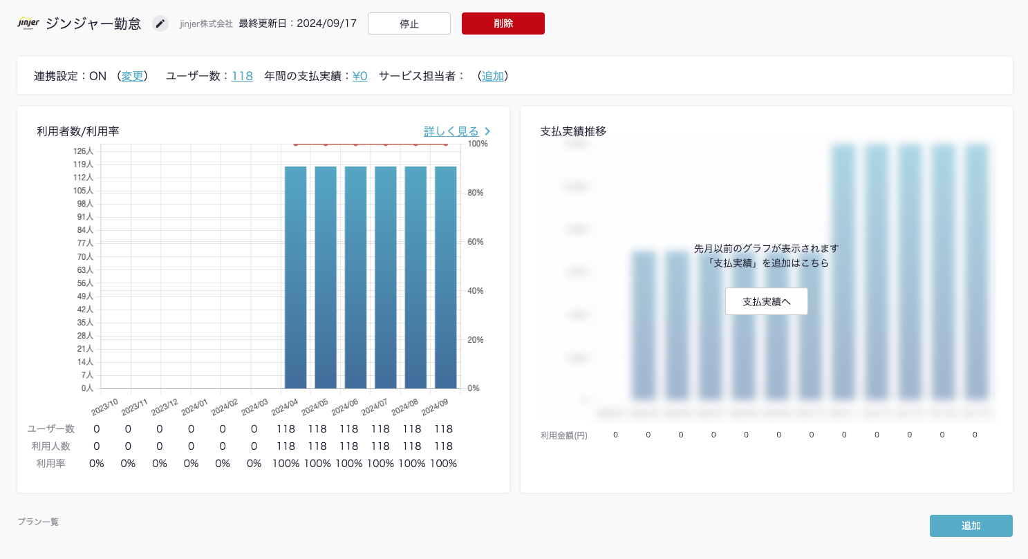 ITboardのサービス詳細画面に戻りますので、そこで「連携設定: ON」になり、「利用者数/利用率」のグラフが見られるようになっていれば、連携成功です。