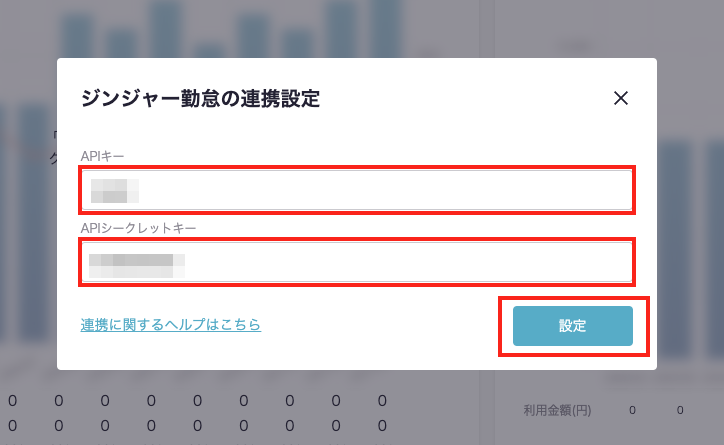 ジンジャー勤怠の連携設定モーダルが出現するので、「APIキー」「APIシークレットキー」を入力し『設定』ボタンを押下します。