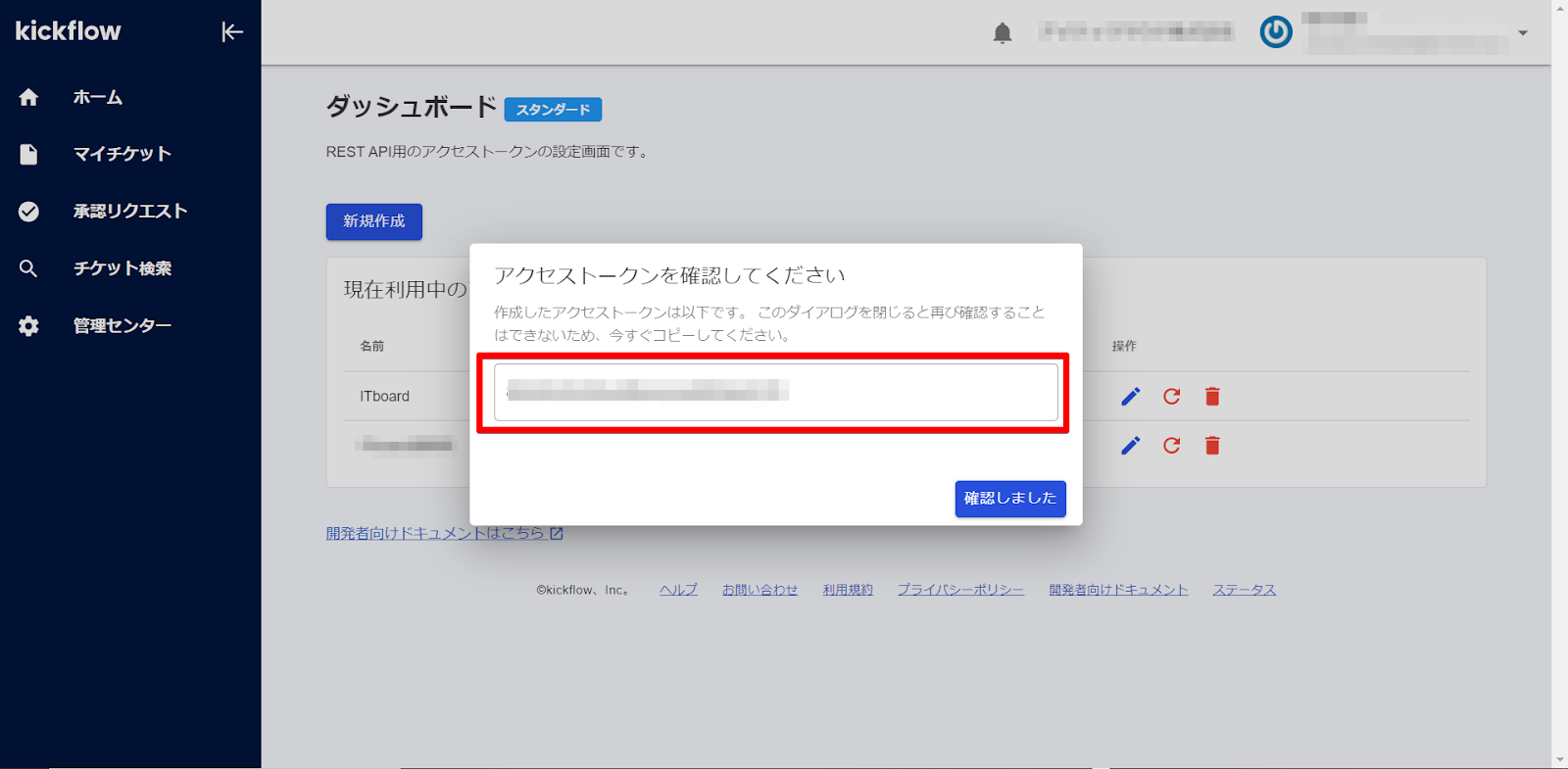 ※画面を閉じるとアクセストークンは再表示できません。