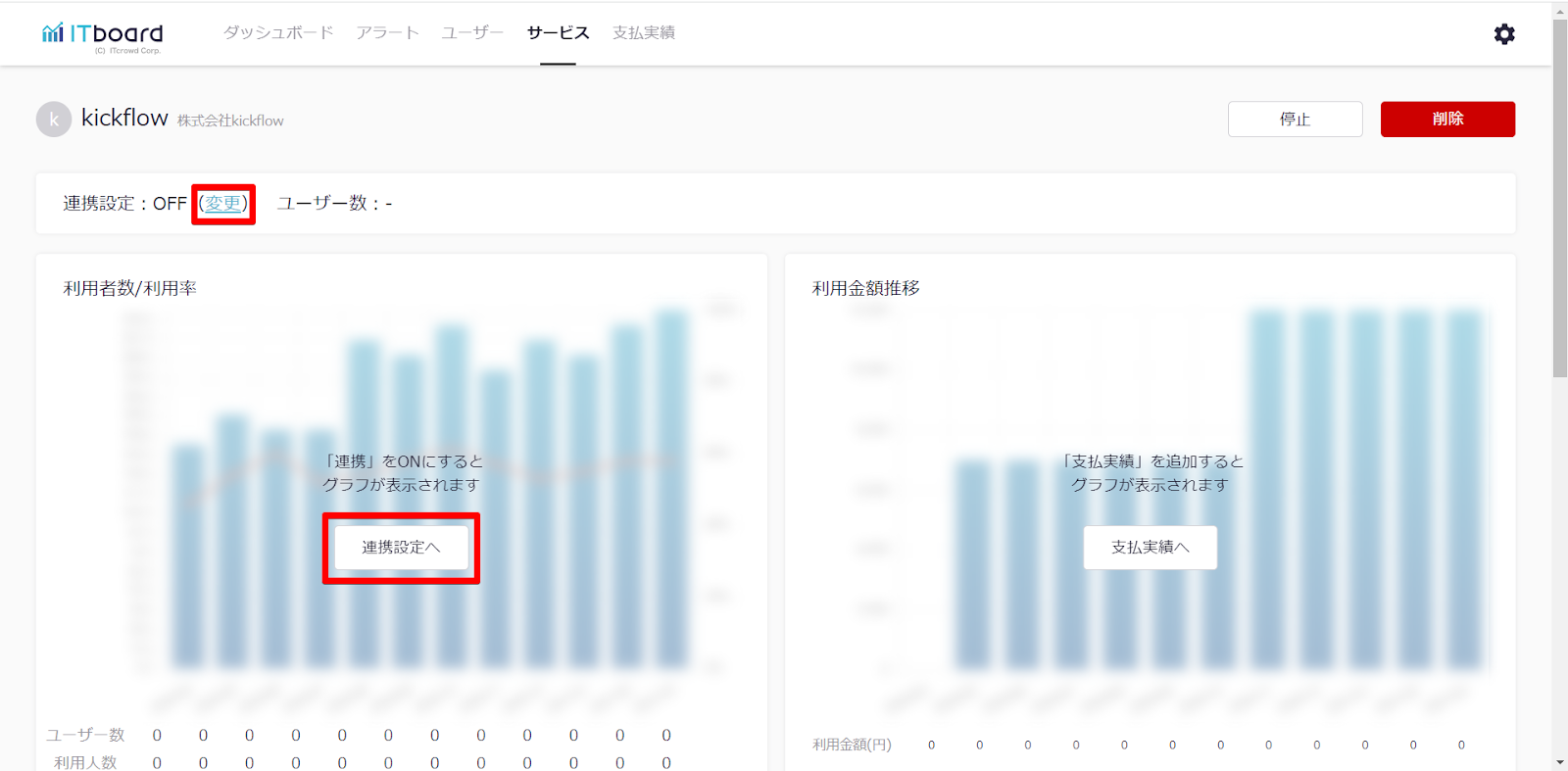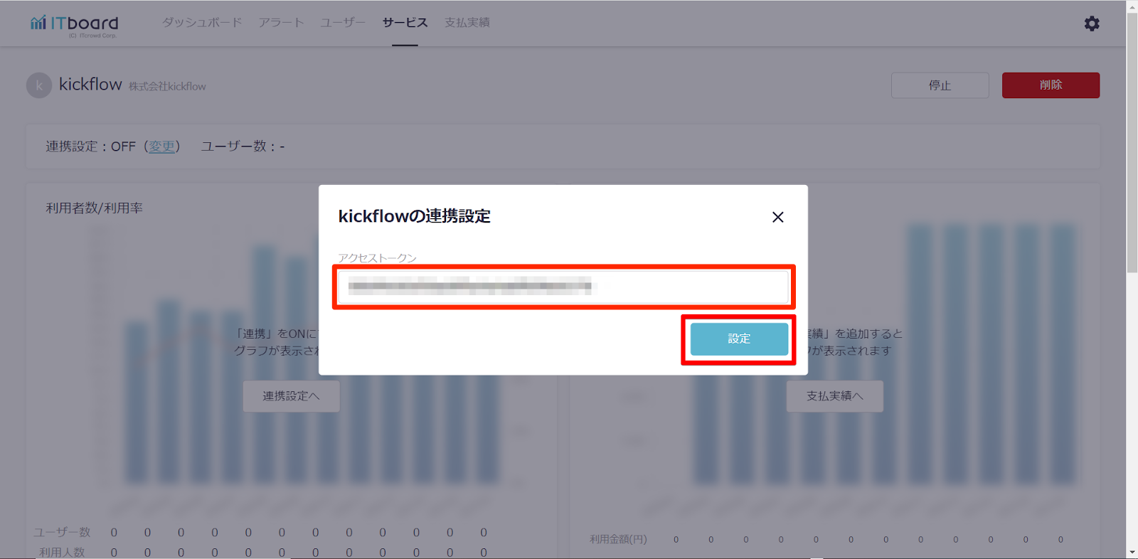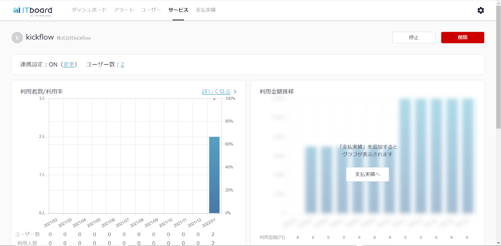 ITboardのサービス詳細画面に戻りますので、そこで「連携設定: ON」になり、「利用者数/利用率」のグラフが見られるようになっていれば、連携成功です。