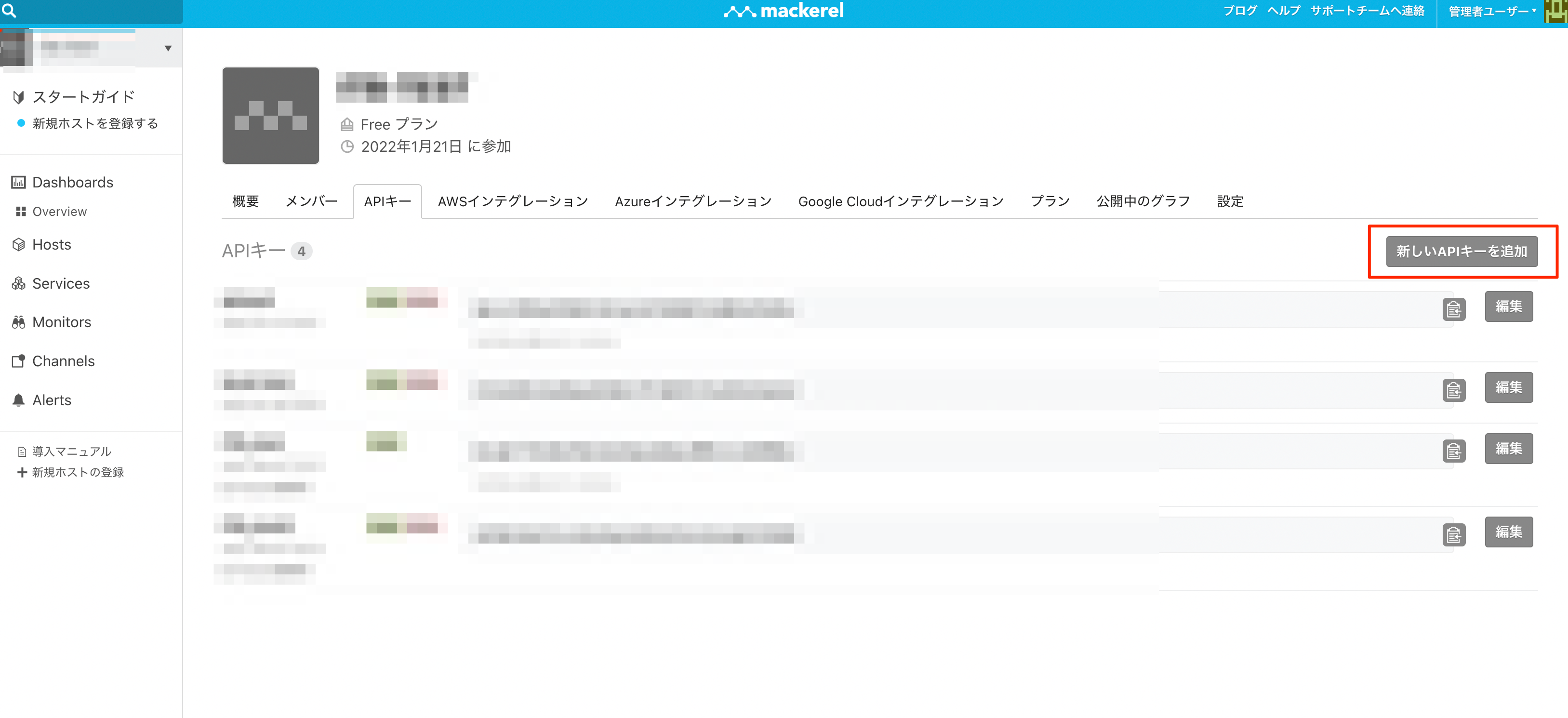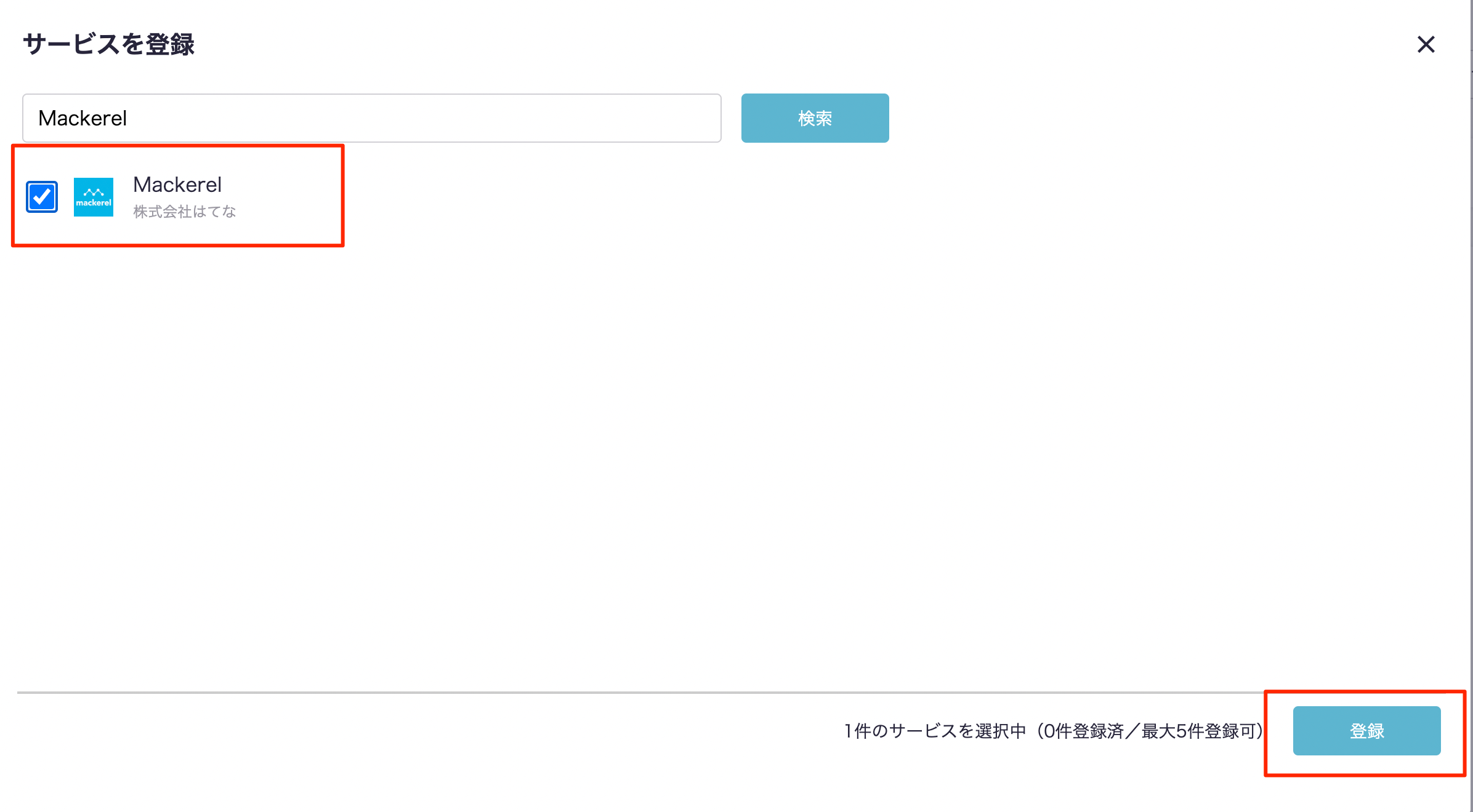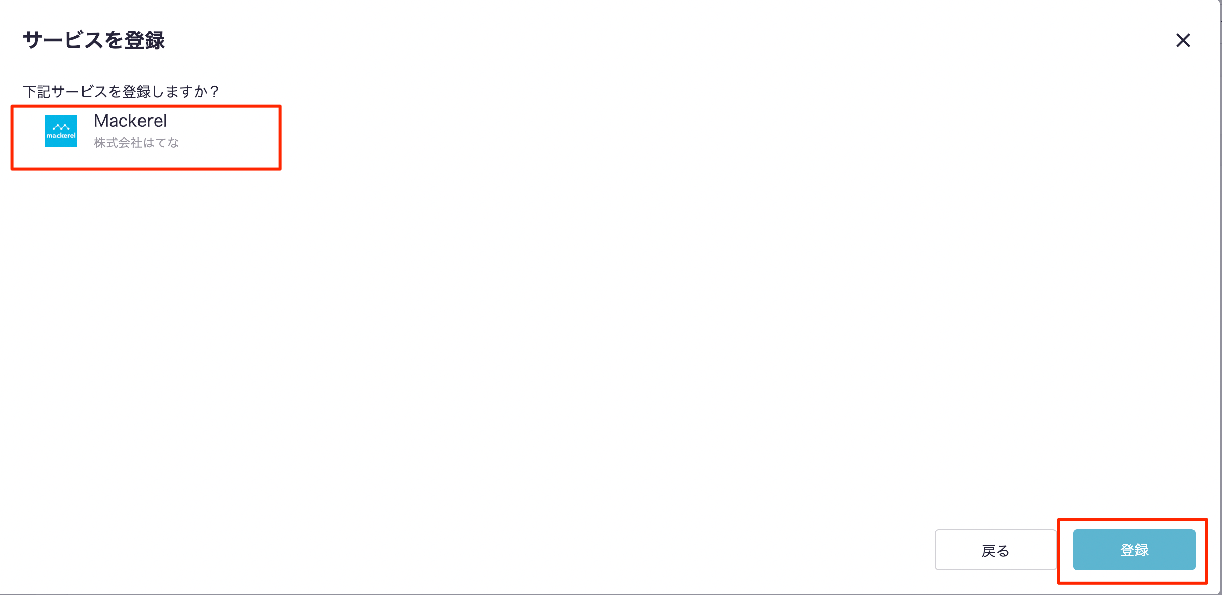 その後、下画像のようなモーダルが出現しますので、入力欄にサービス名である「Mackerel」と入力します。