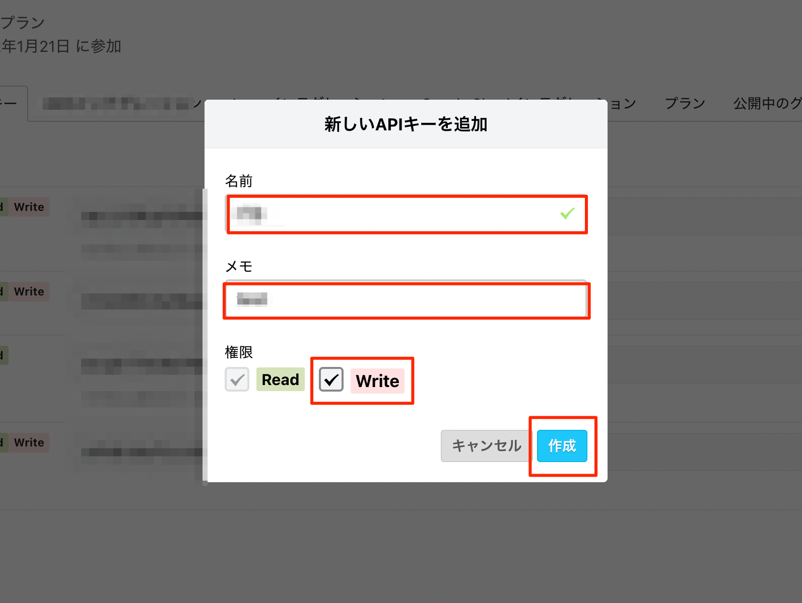 任意の名前とメモを入力し、書き込み権限(Write)にチェックした状態で『作成』ボタンを押下します。
