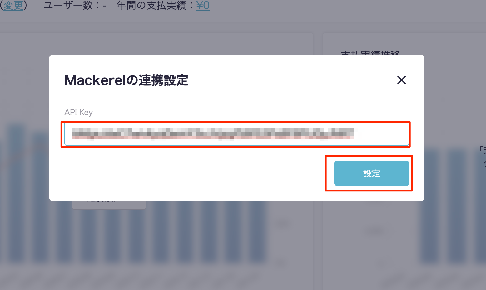 Mackerelの連携設定モーダルが出現するので、「API Key」を入力し『設定』ボタンを押下します。