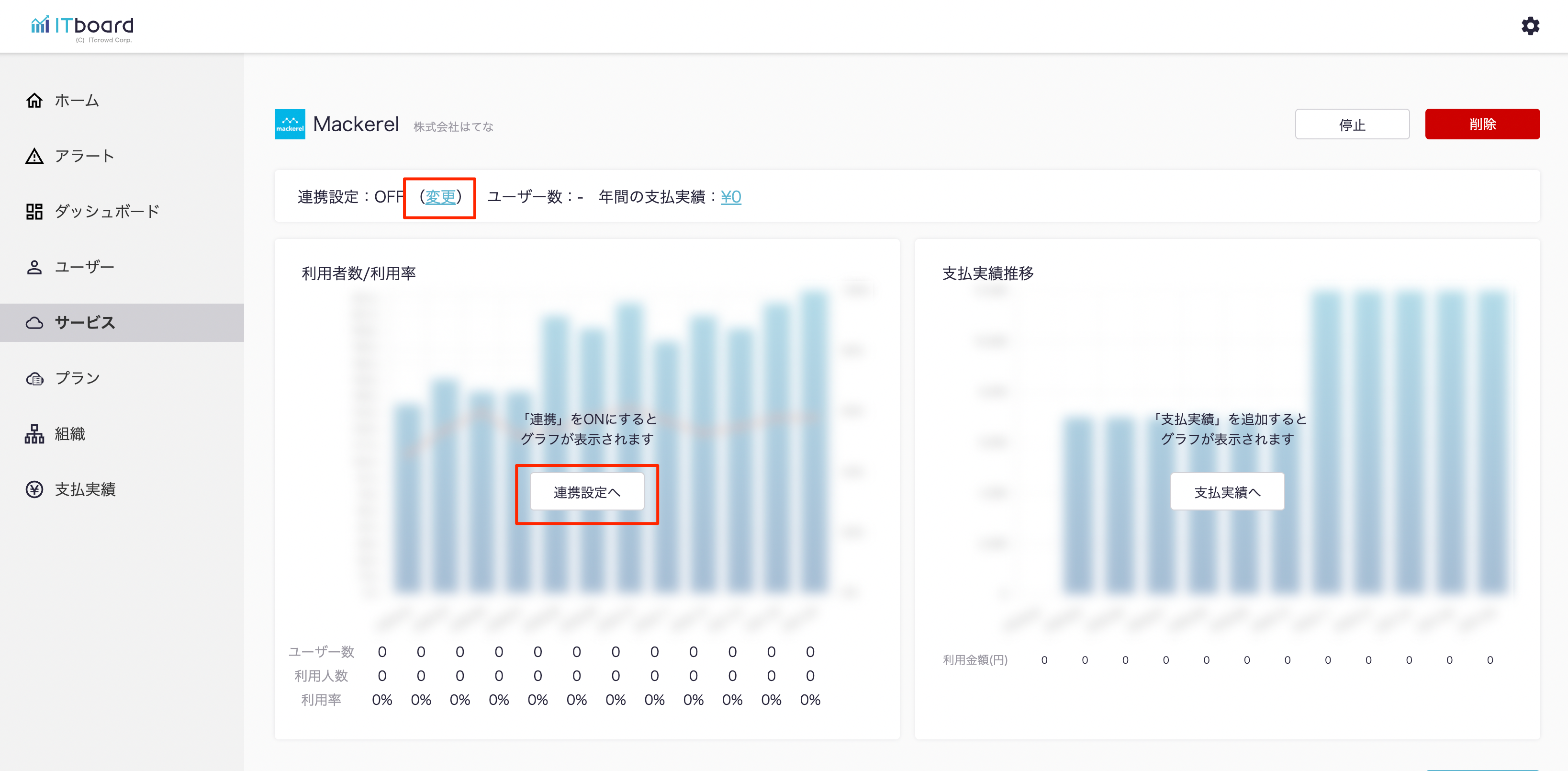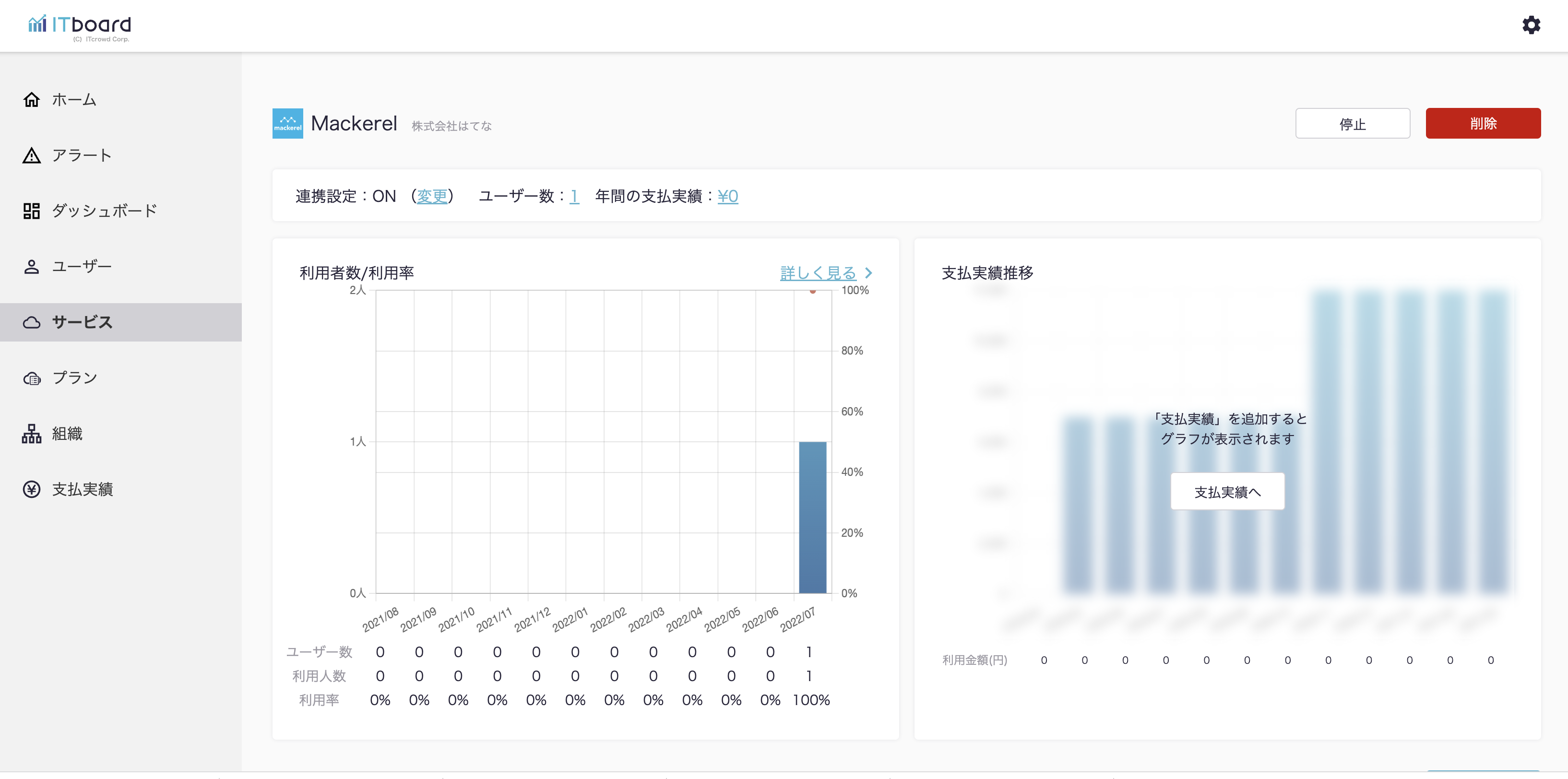 ITboardのサービス詳細画面に戻りますので、そこで「連携設定: ON」になり、「利用者数/利用率」のグラフが見られるようになっていれば、連携成功です。