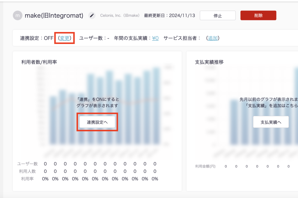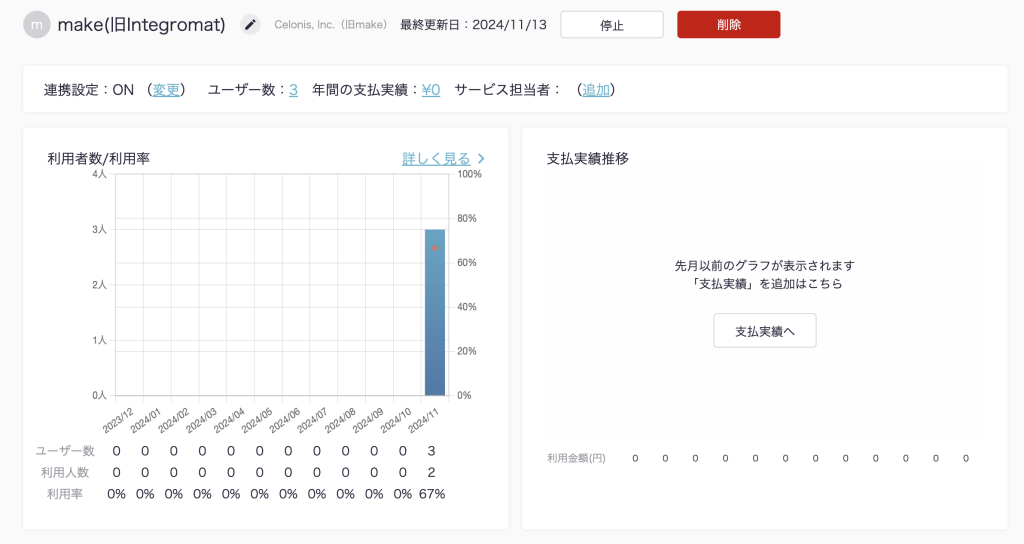 ITboardのサービス詳細画面に戻りますので、そこで「連携設定: ON」になり、「利用者数/利用率」のグラフが見られるようになっていれば、連携成功です。