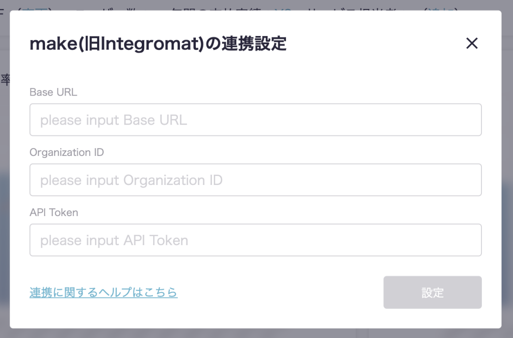 makeの連携設定モーダルが出現するので、以下のことを入力し『設定』ボタンを押下します。