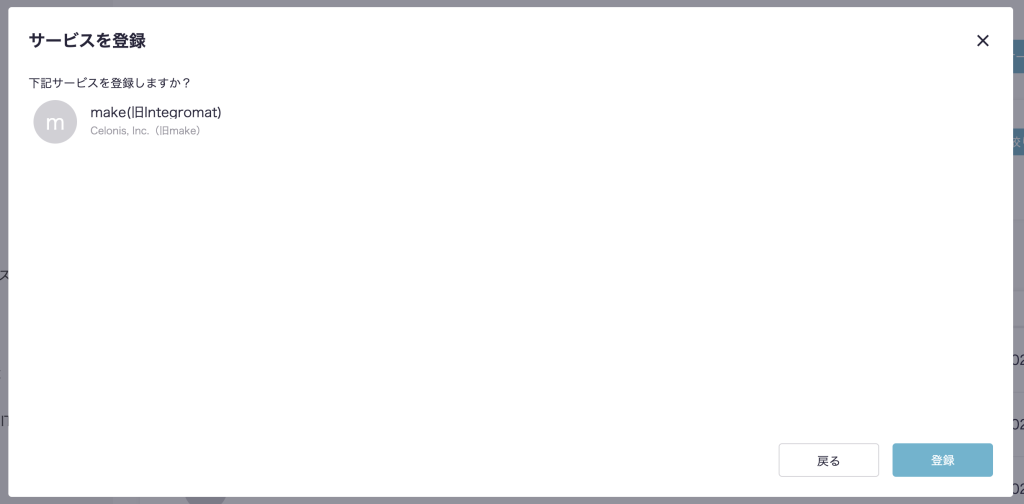 サイドメニューから『サービス』を選択し、『サービスを追加』ボタンを押下します。その後、下画像のようなモーダルが出現しますので、入力欄にサービス名である「make」と入力します。出てきた検索結果から『make(旧Integromat)』を選択します。
