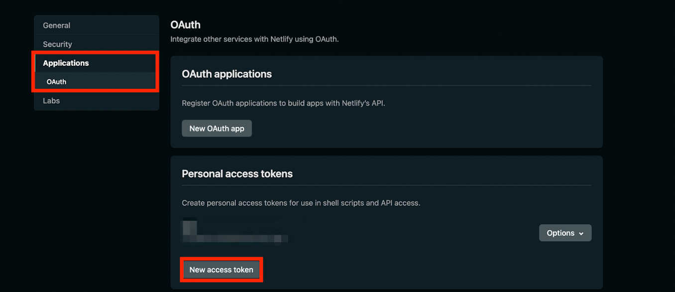 『「Applications』を選択し、『OAuth』を押下します。 『New access token』」ボタンを押下します。