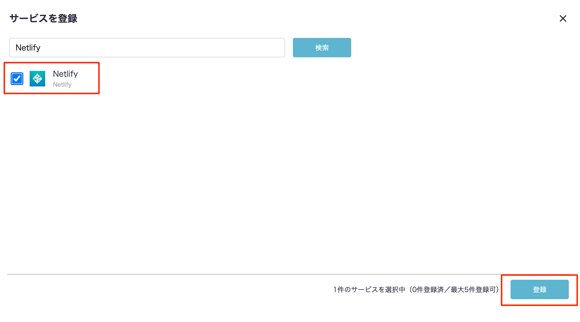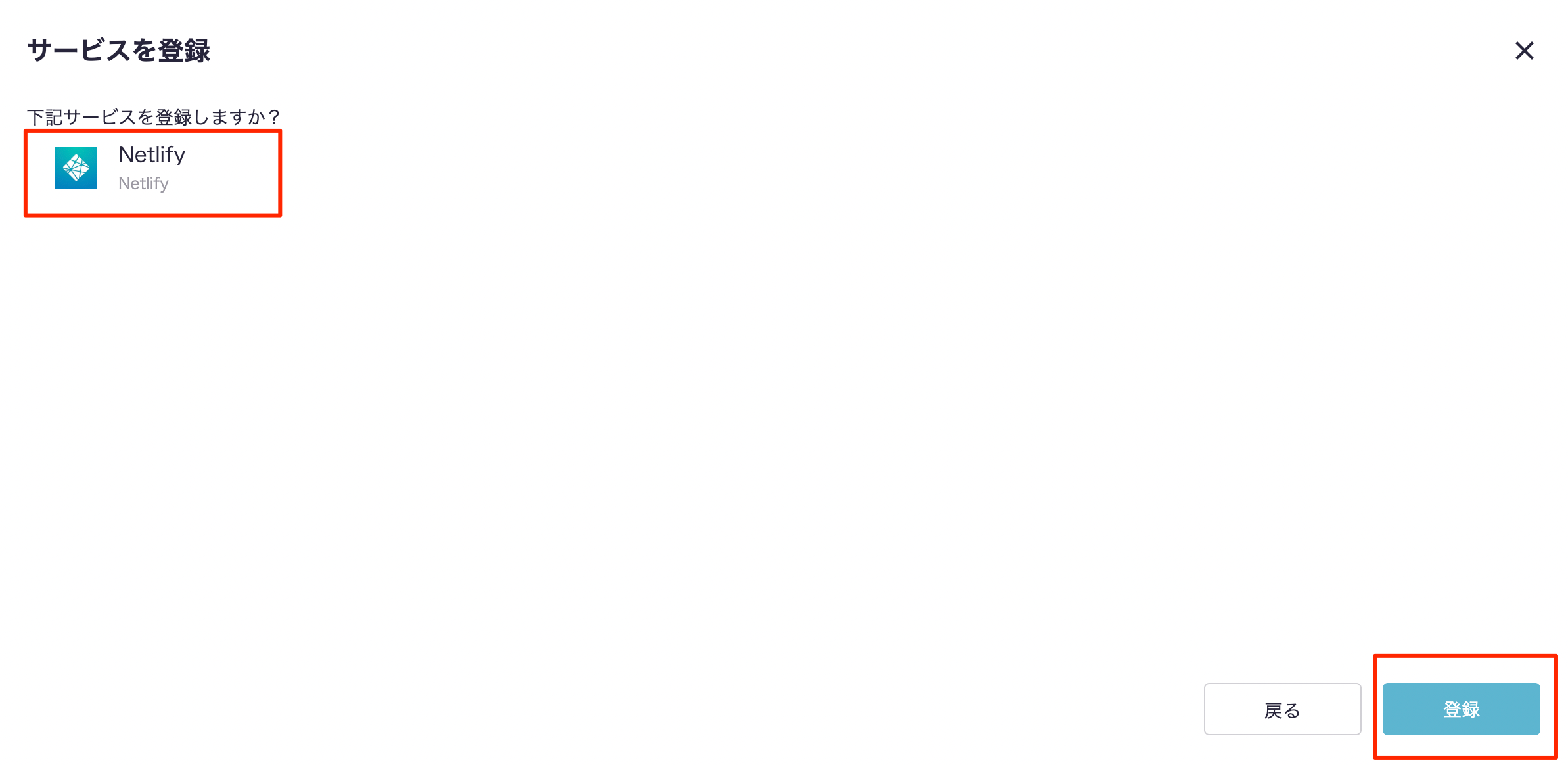 その後、下画像のようなモーダルが出現しますので、入力欄にサービス名である「Netlify」と入力します。
