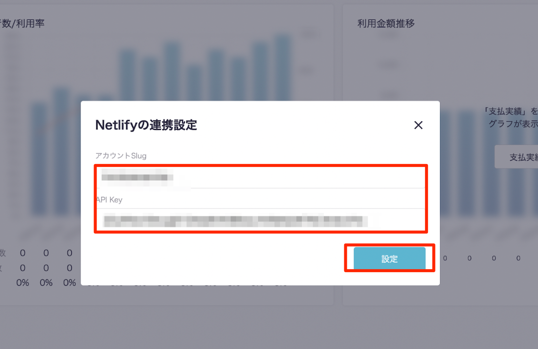 Netlifyの連携設定モーダルが出現するので、「アカウントSlug」と「API Key」を入力し『設定』ボタンを押下します。