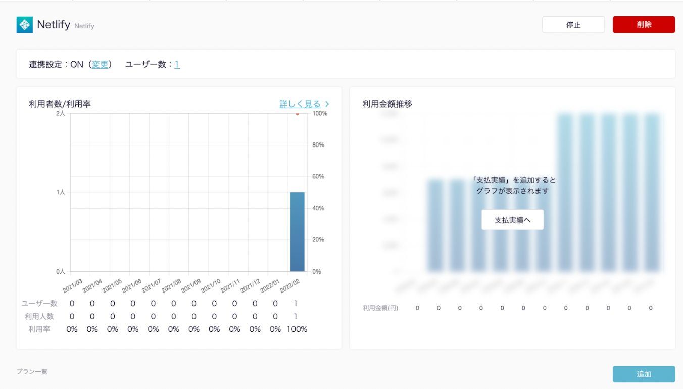 ITboardのサービス詳細画面に戻りますので、そこで「連携設定: ON」になり、「利用者数/利用率」のグラフが見られるようになっていれば、連携成功です。