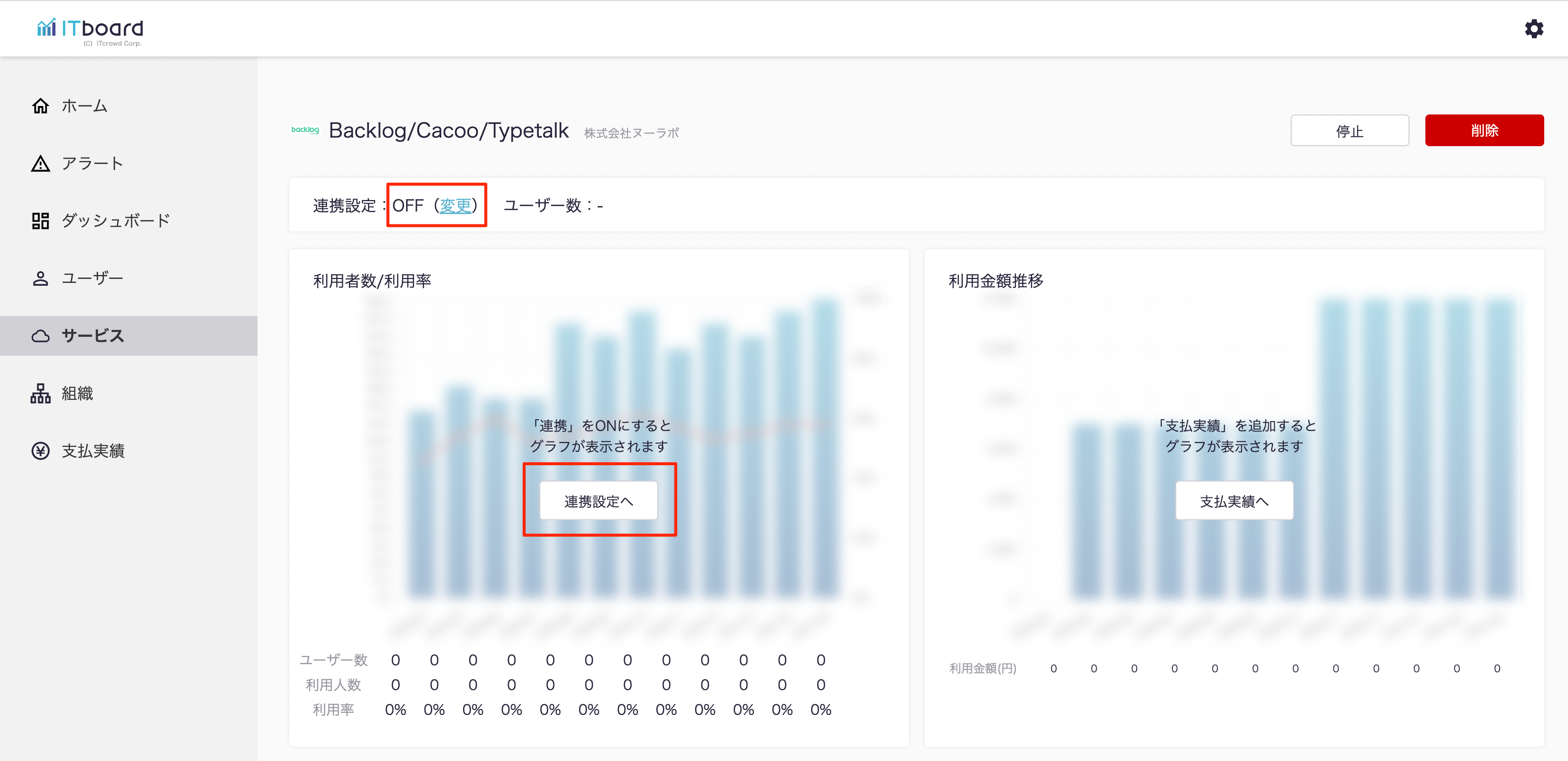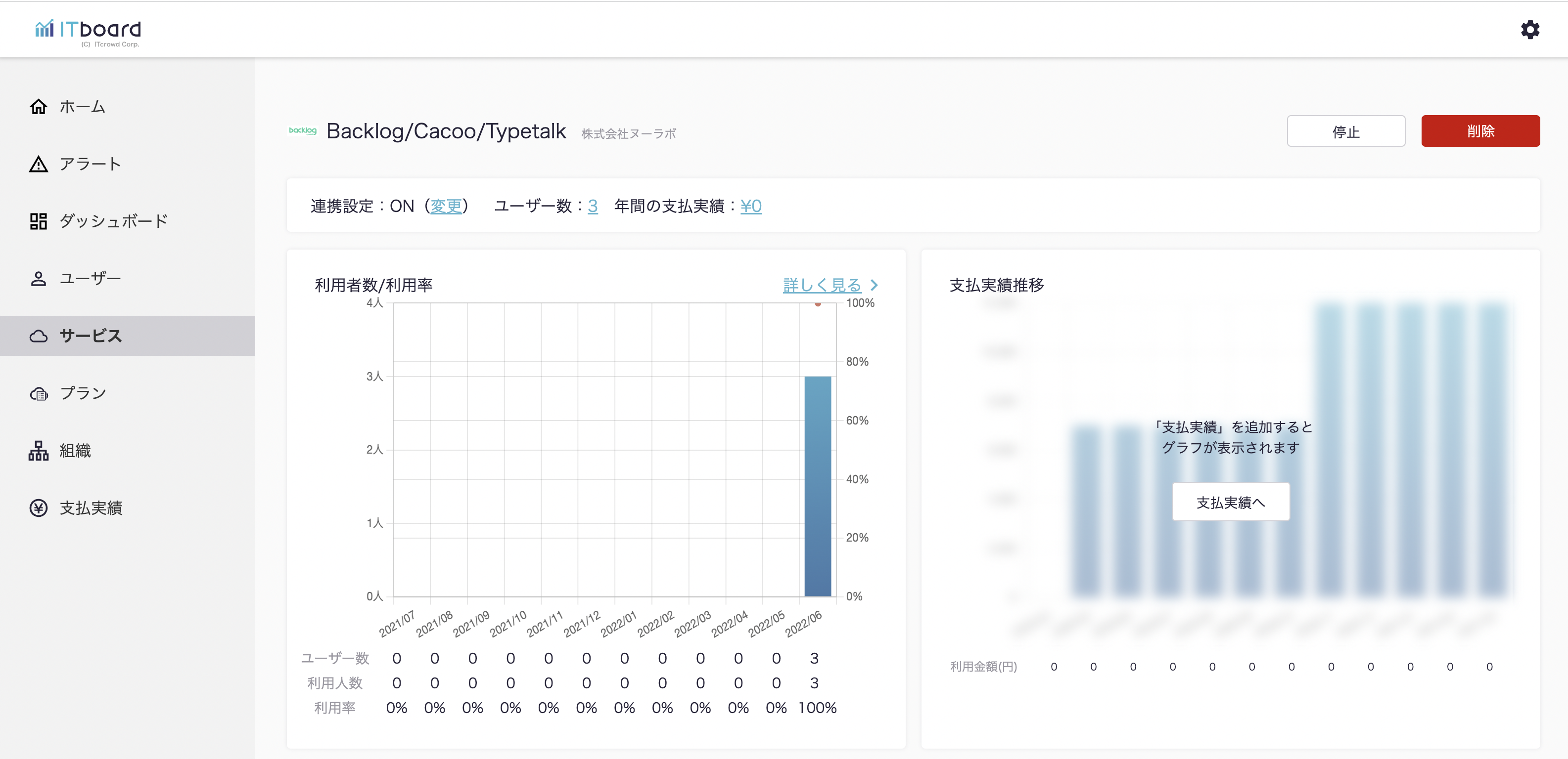 ITboardのサービス詳細画面に戻りますので、そこで「連携設定: ON」になり、「利用者数/利用率」のグラフが見られるようになっていれば、連携成功です。