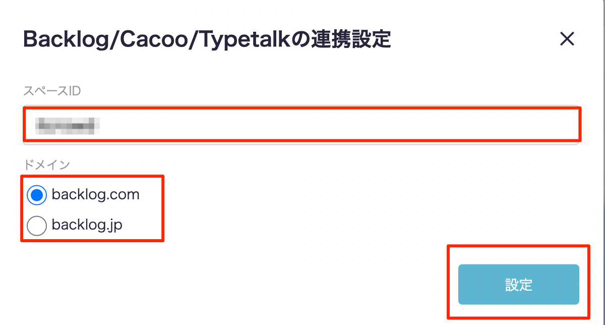 スペースIDを入力し、ドメインを選択して『設定』ボタンを押下します。