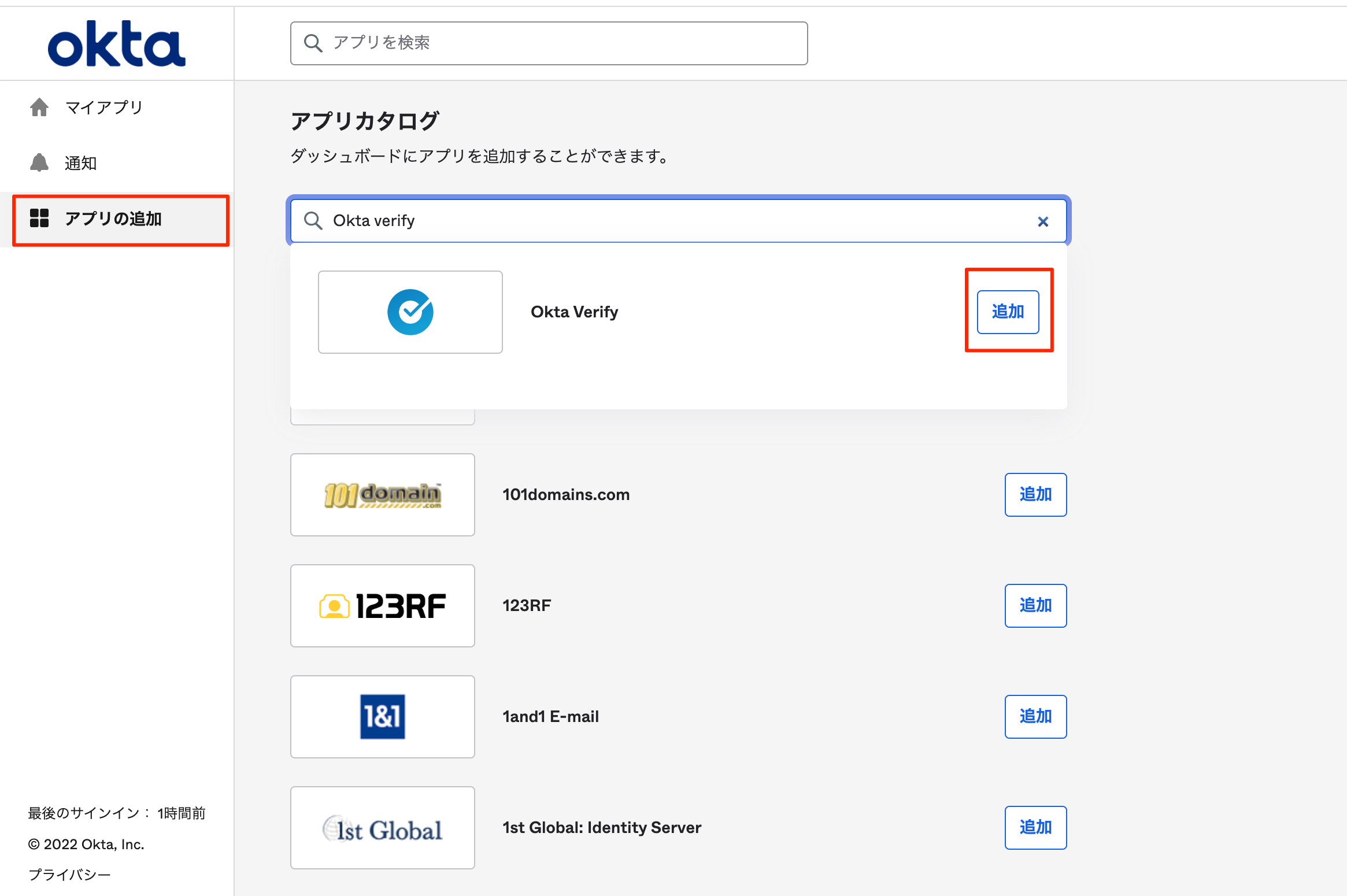 『アプリの追加』を押下し、「Okta verify」と検索して『追加』ボタンを押下します。