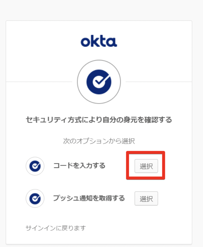 Okta verifyアプリを使用し、『選択』ボタンを押下します。