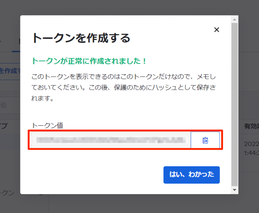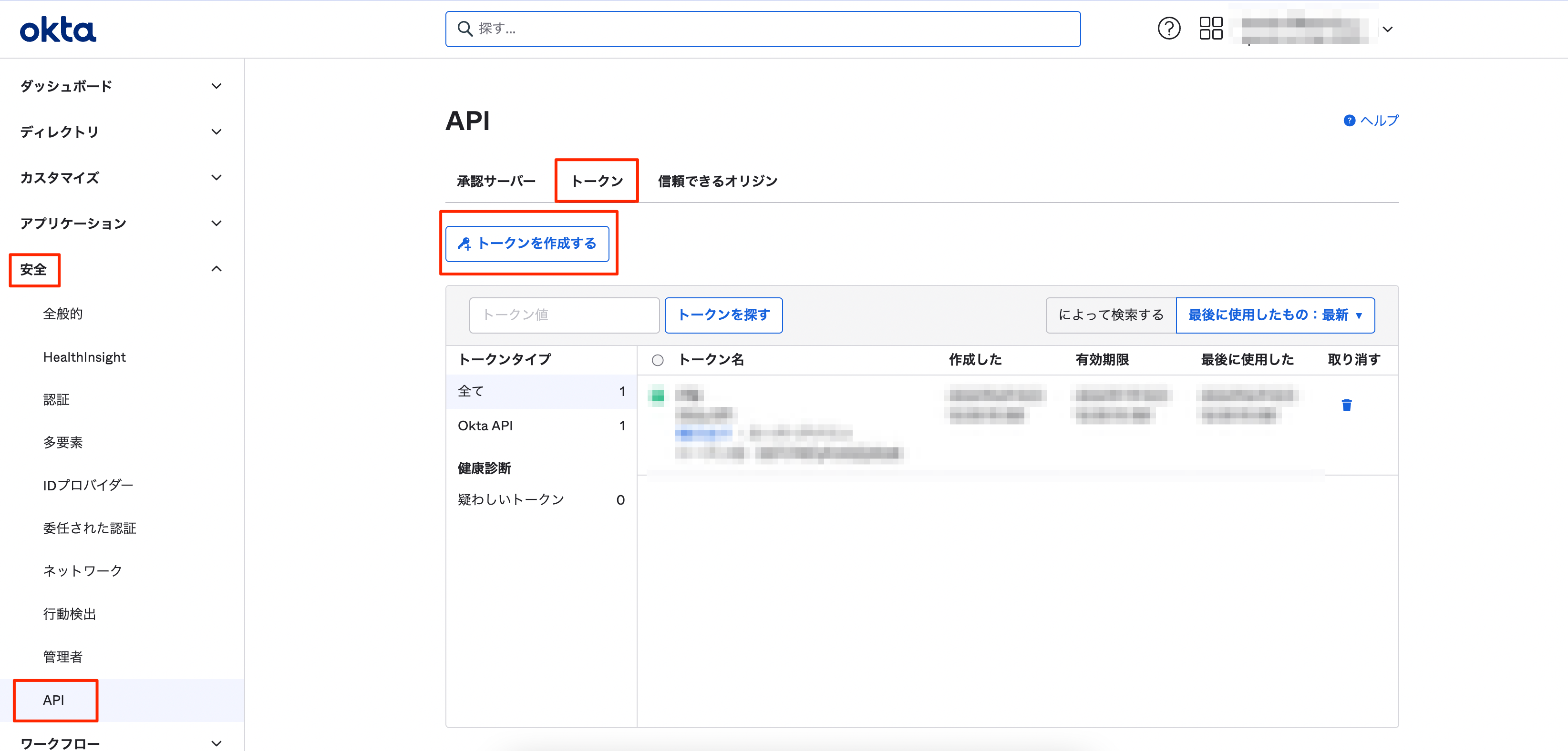 『安全』ボタンを押下し、『API』を選択します。『トークン』から『トークンを作成する』を押下します。