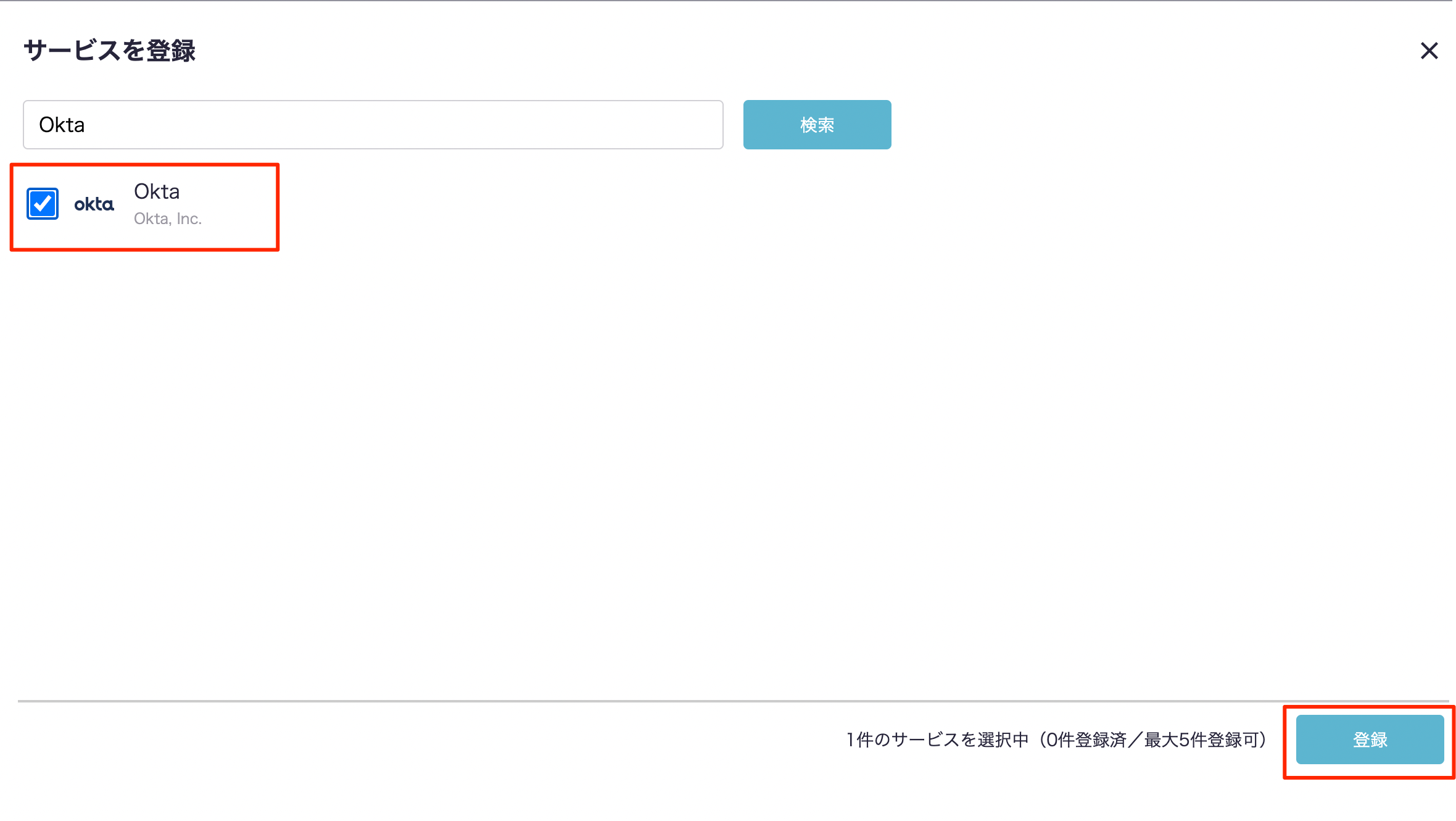 その後、下画像のようなモーダルが出現しますので、入力欄にサービス名である「Okta」と入力します。