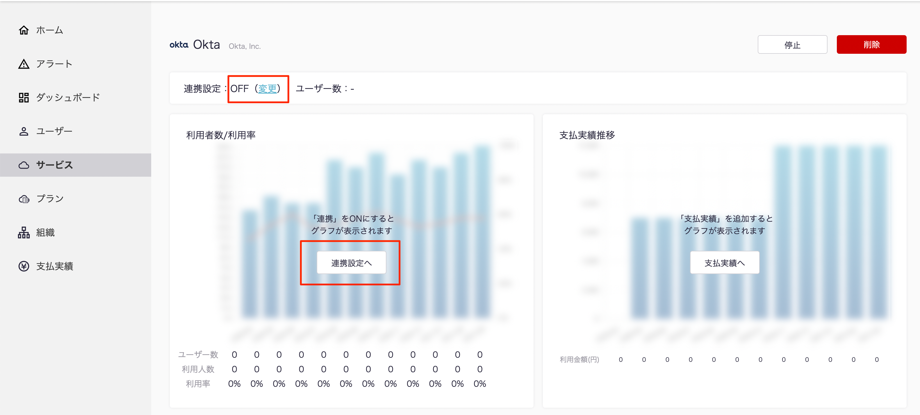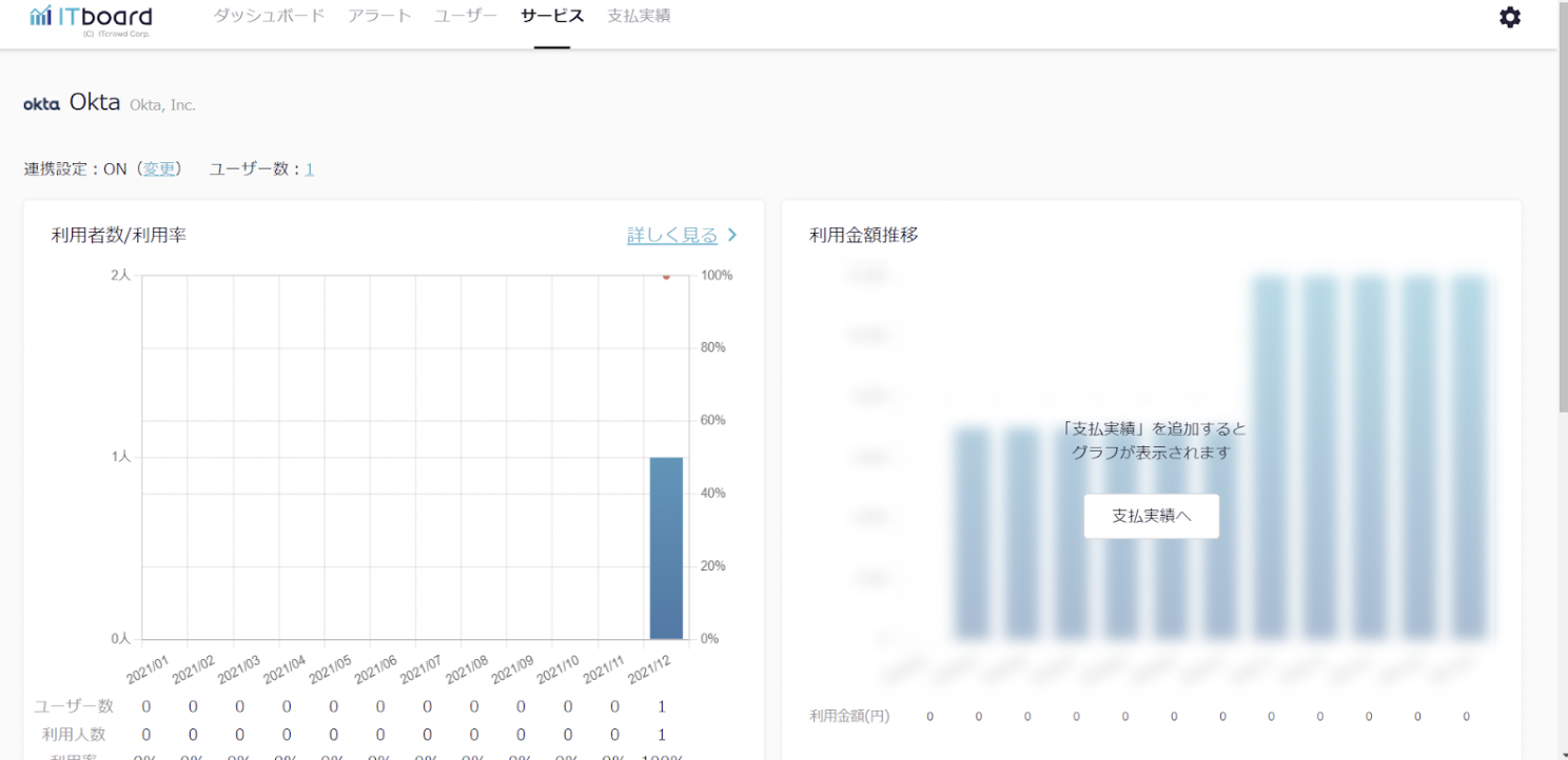 ITboardのサービス詳細画面に戻りますので、そこで「連携設定: ON」になり、「利用者数/利用率」のグラフが見られるようになっていれば、連携成功です。