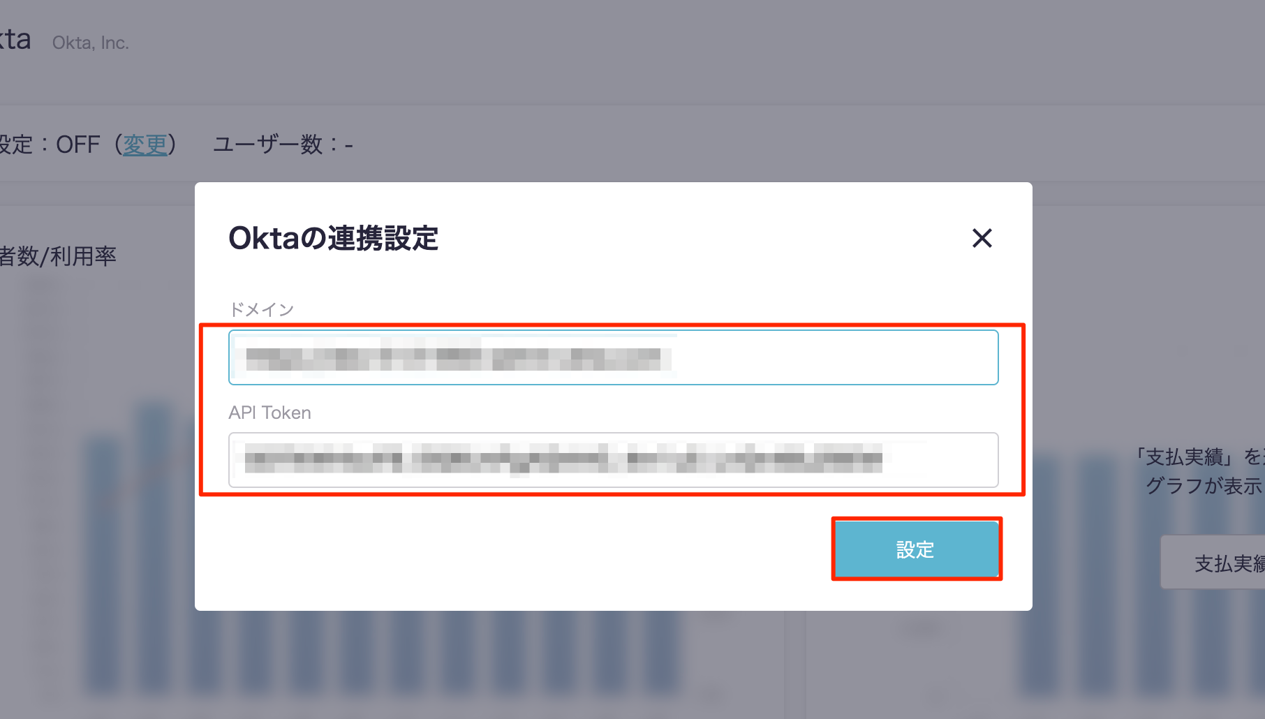 Oktaの連携設定モーダルが出現するので、ドメインとAPIトークンを入力し『設定』ボタンを押下します。