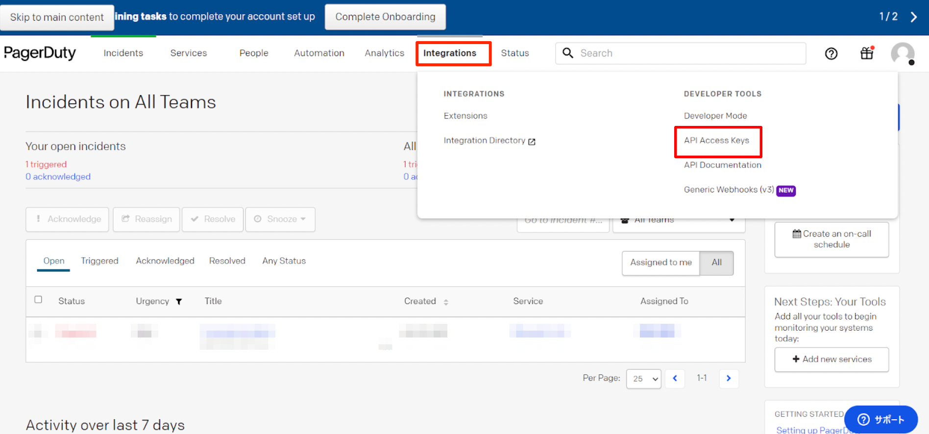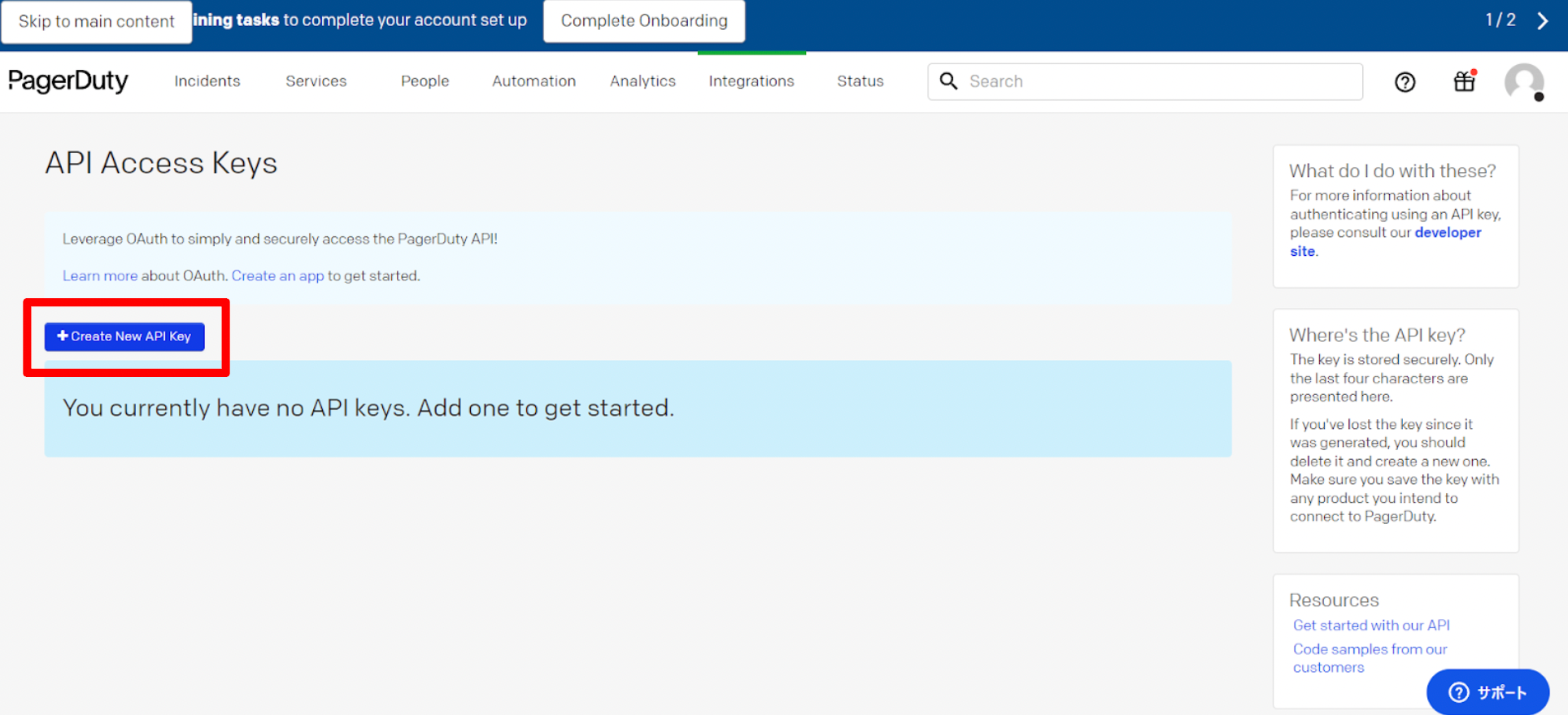 ヘッダの『Integrations』を選択し、『API Access Keys』を押下します。