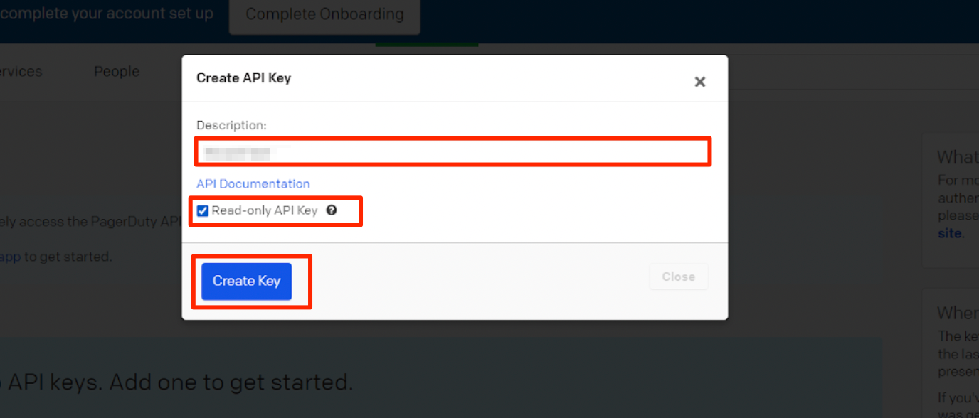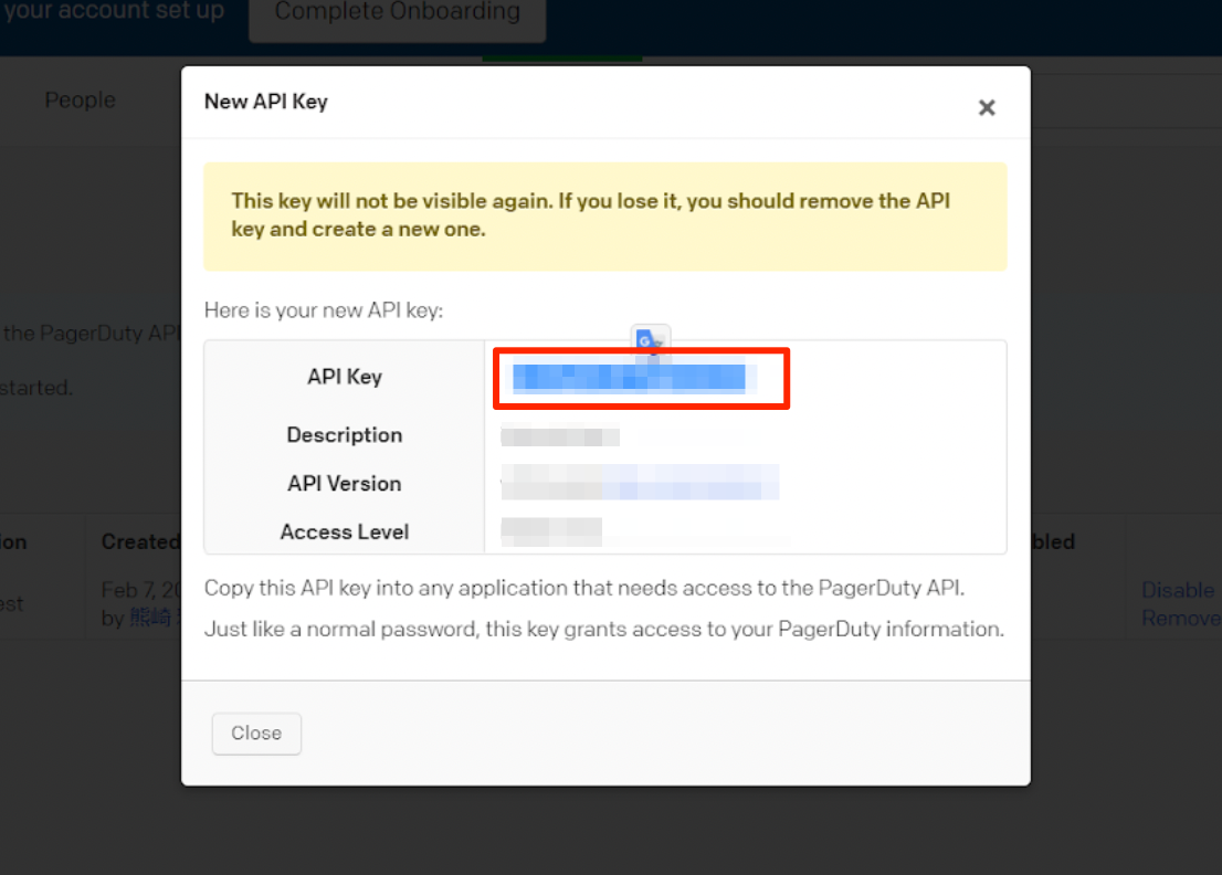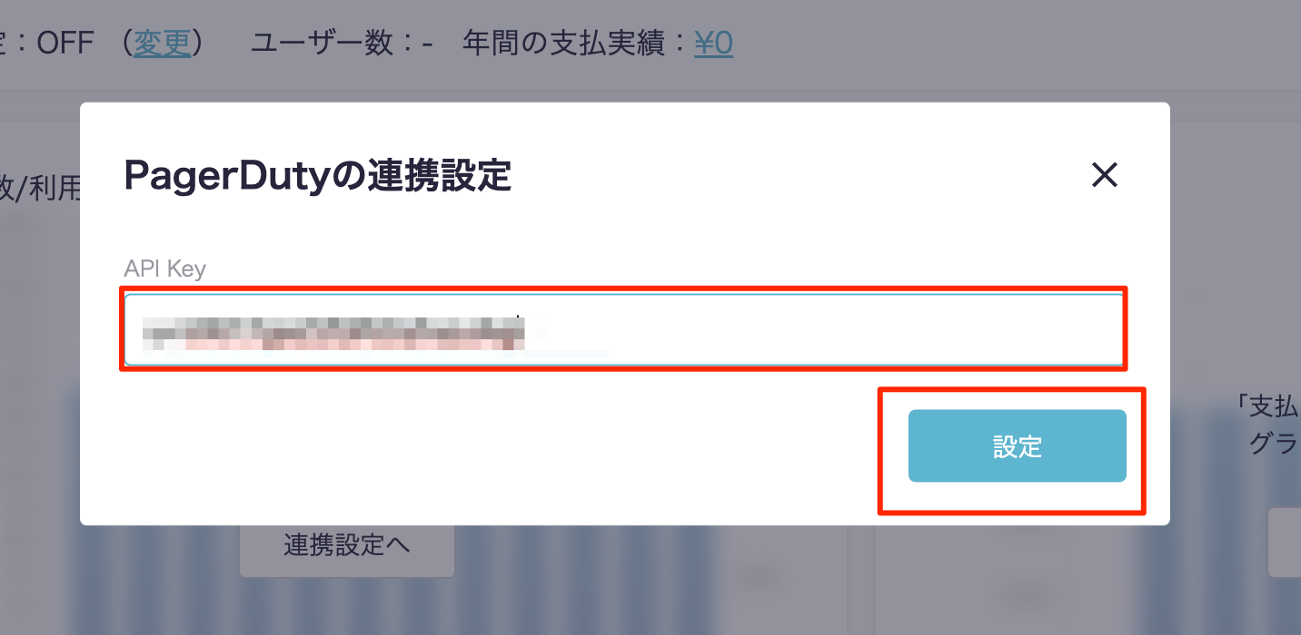 PagerDutyの連携設定モーダルが出現するので、API Keyを入力し『設定』ボタンを押下します。