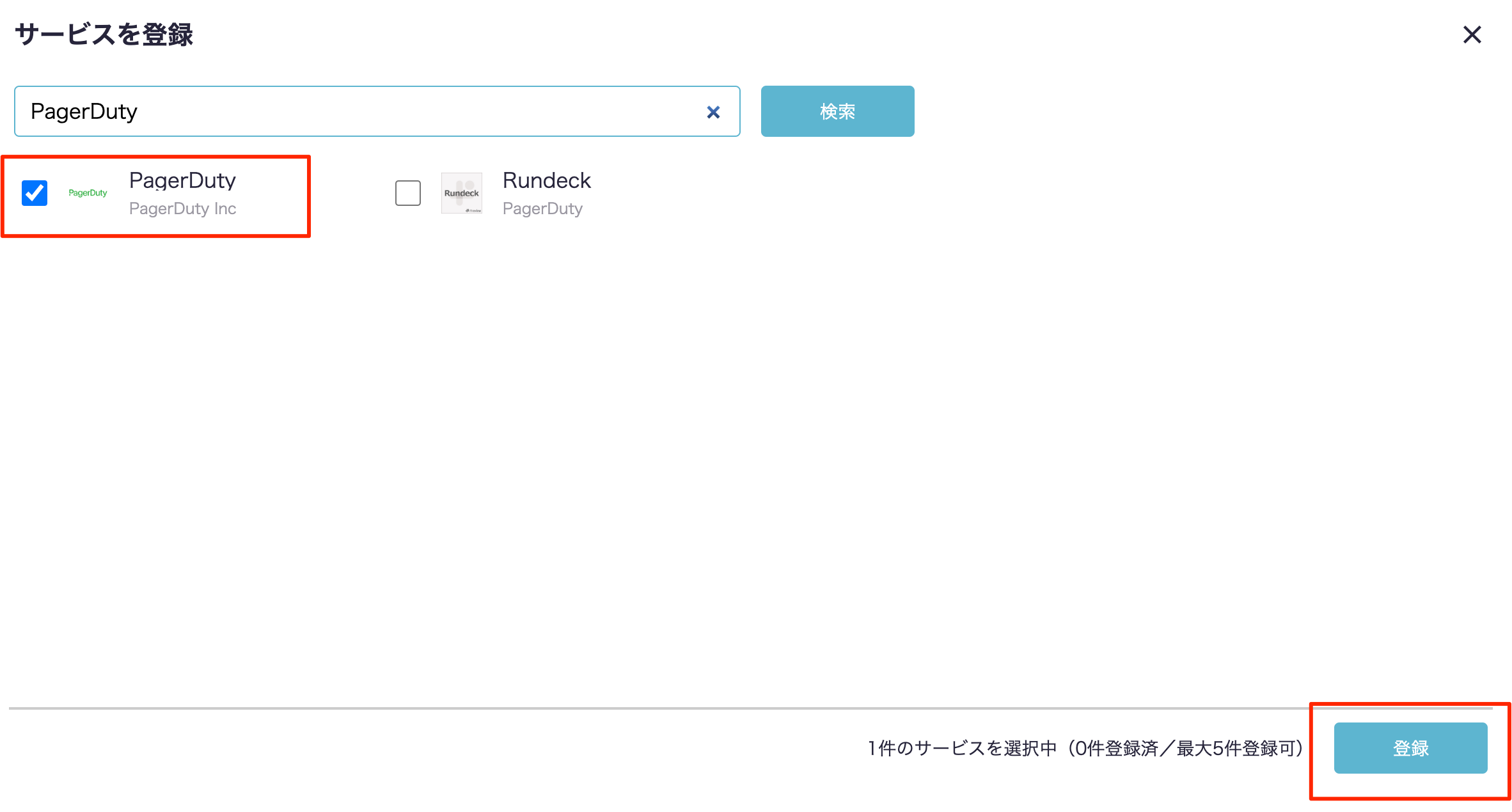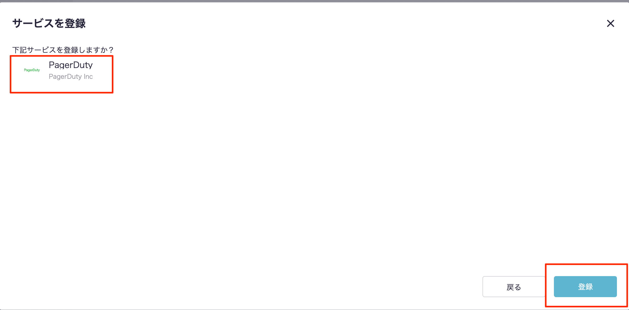 その後、下画像のようなモーダルが出現しますので、入力欄にサービス名である「PagerDuty」と入力します。