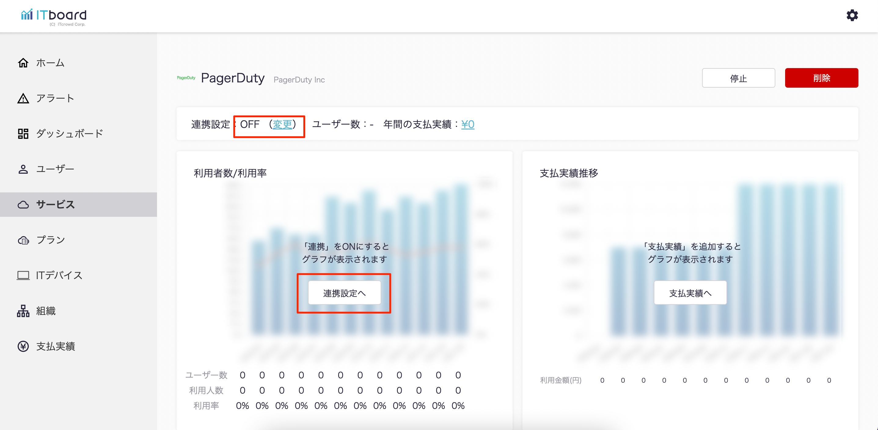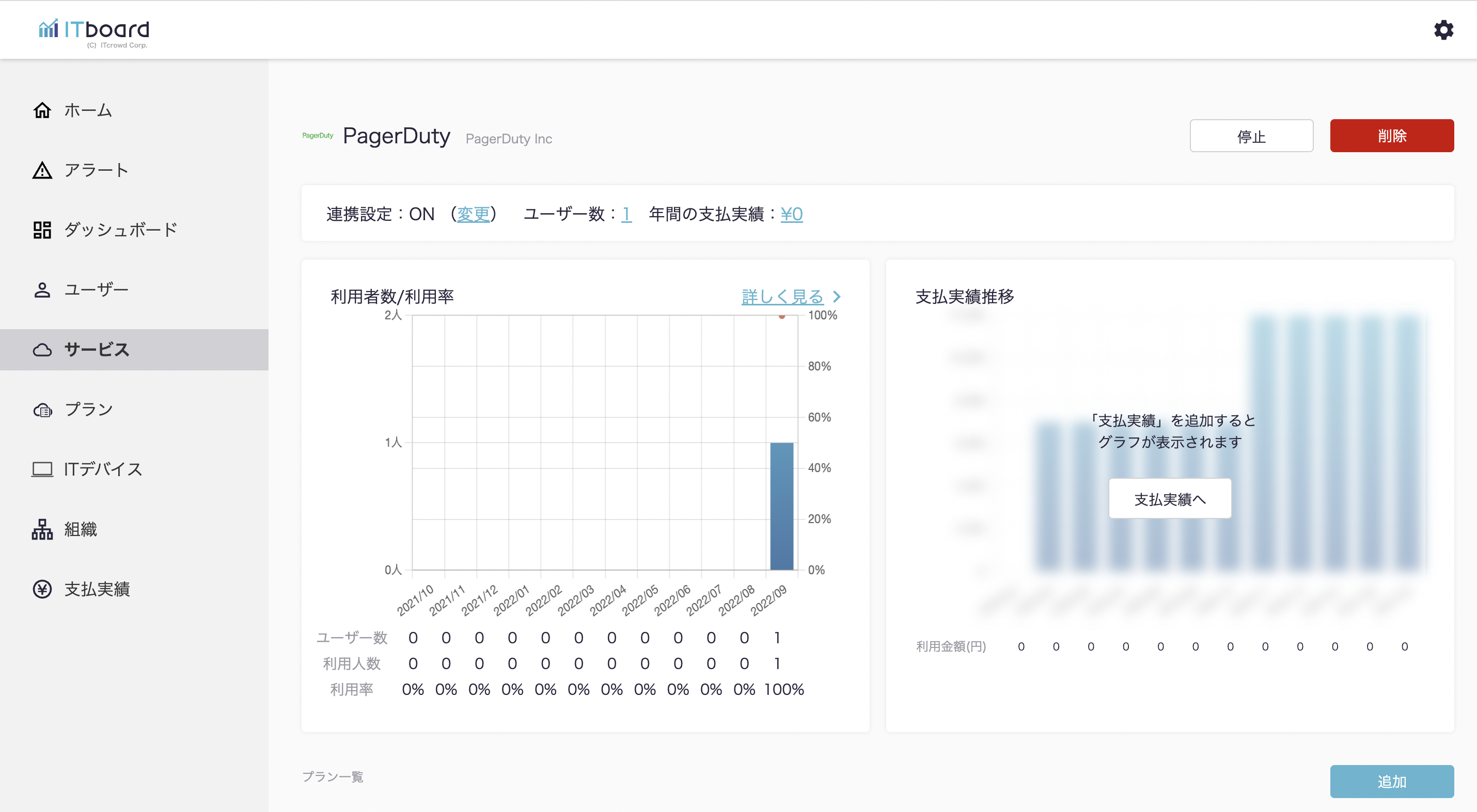 ITboardのサービス詳細画面に戻りますので、そこで「連携設定: ON」になり、「利用者数/利用率」のグラフが見られるようになっていれば、連携成功です。