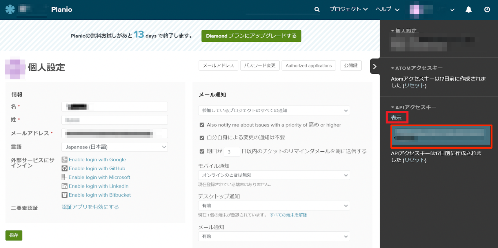 個人設定画面の右からAPIアクセスキーを表示可能となるため、アクセスキーをコピーして保管します