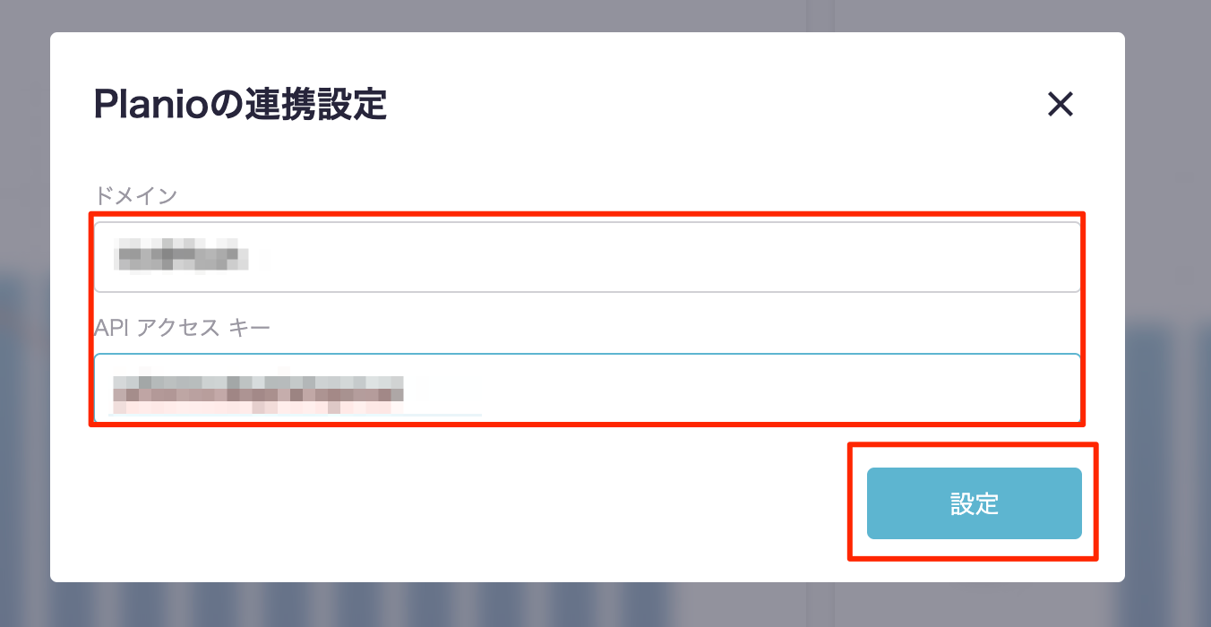Planioの連携設定モーダルが出現するので、ドメインとAPIアクセスキーを入力し『設定』ボタンを押下します。