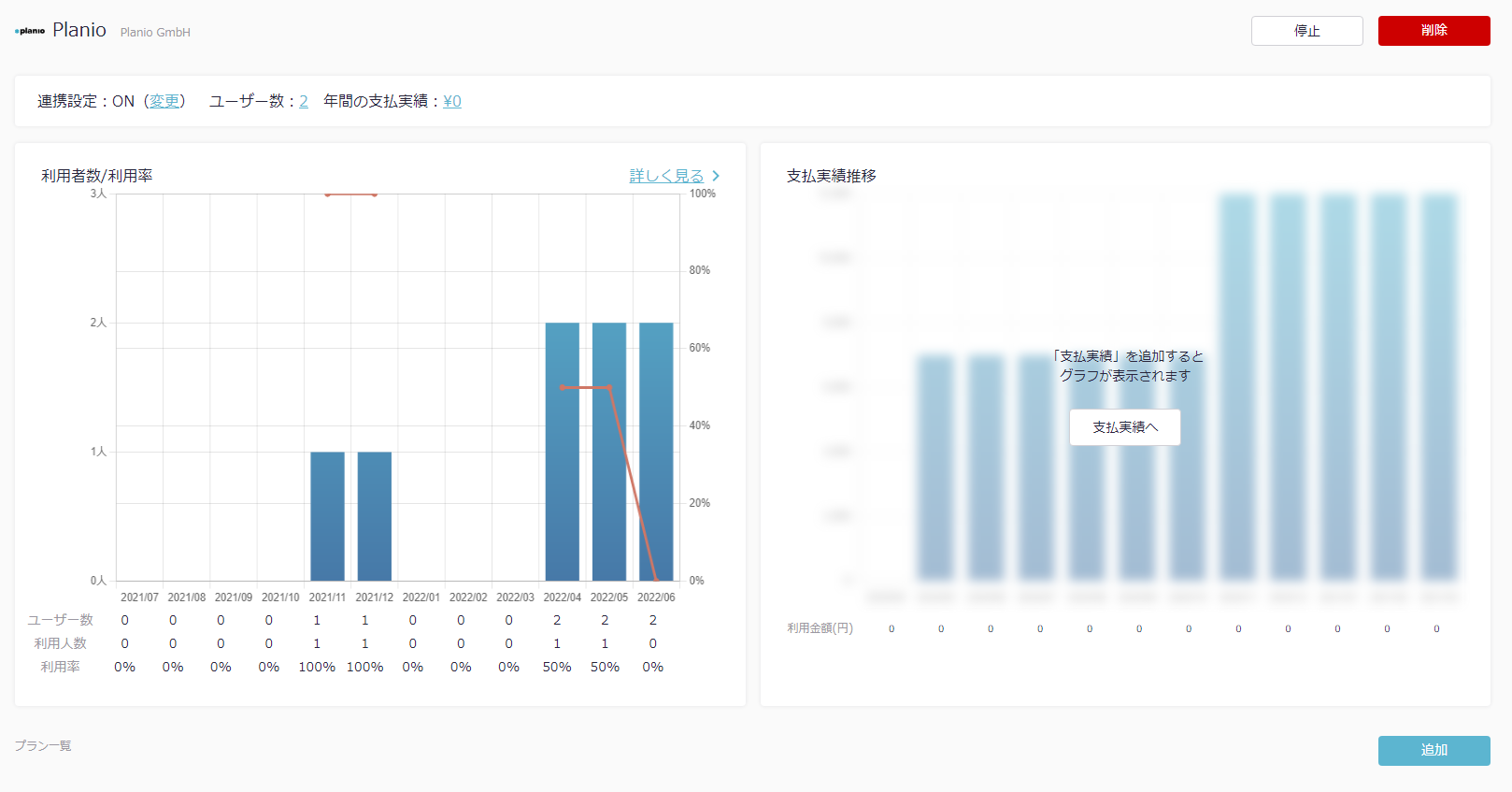 ITboardのサービス詳細画面に戻りますので、そこで「連携設定: ON」になり、「利用者数/利用率」のグラフが見られるようになっていれば、連携成功です。