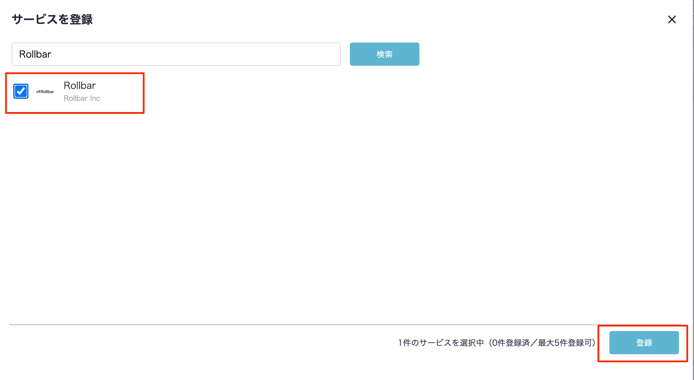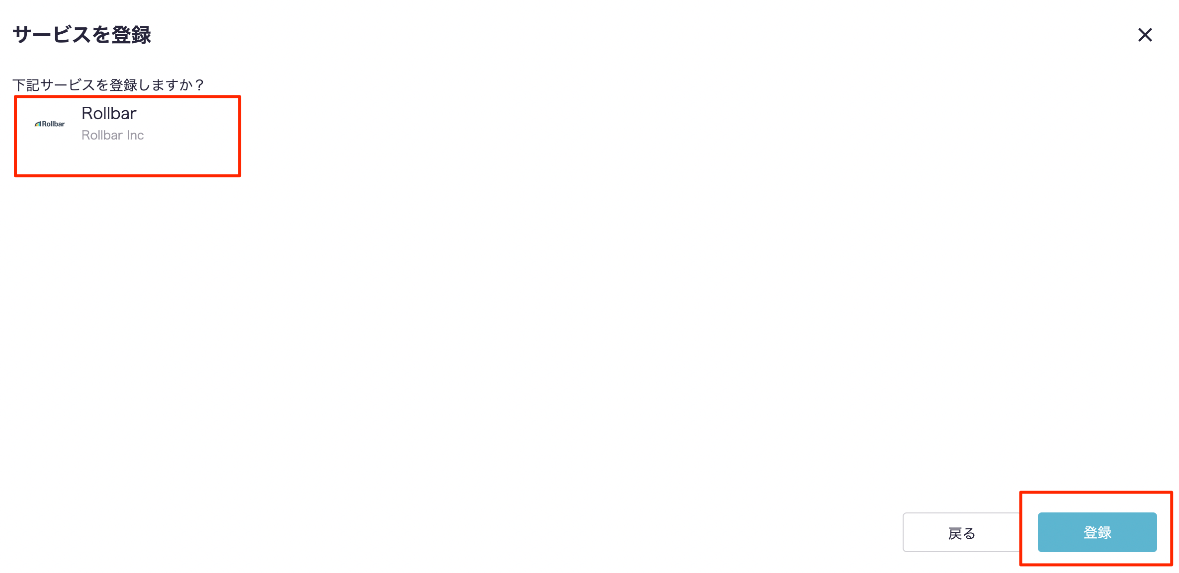 その後、下画像のようなモーダルが出現しますので、入力欄にサービス名である「Rollbar」と入力します。