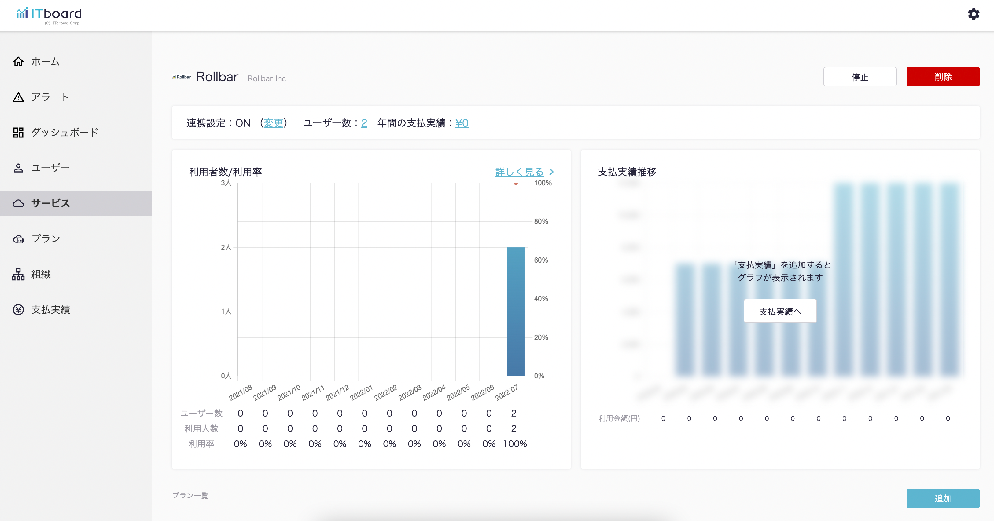 ITboardのサービス詳細画面に戻りますので、そこで「連携設定: ON」になり、「利用者数/利用率」のグラフが見られるようになっていれば、連携成功です。