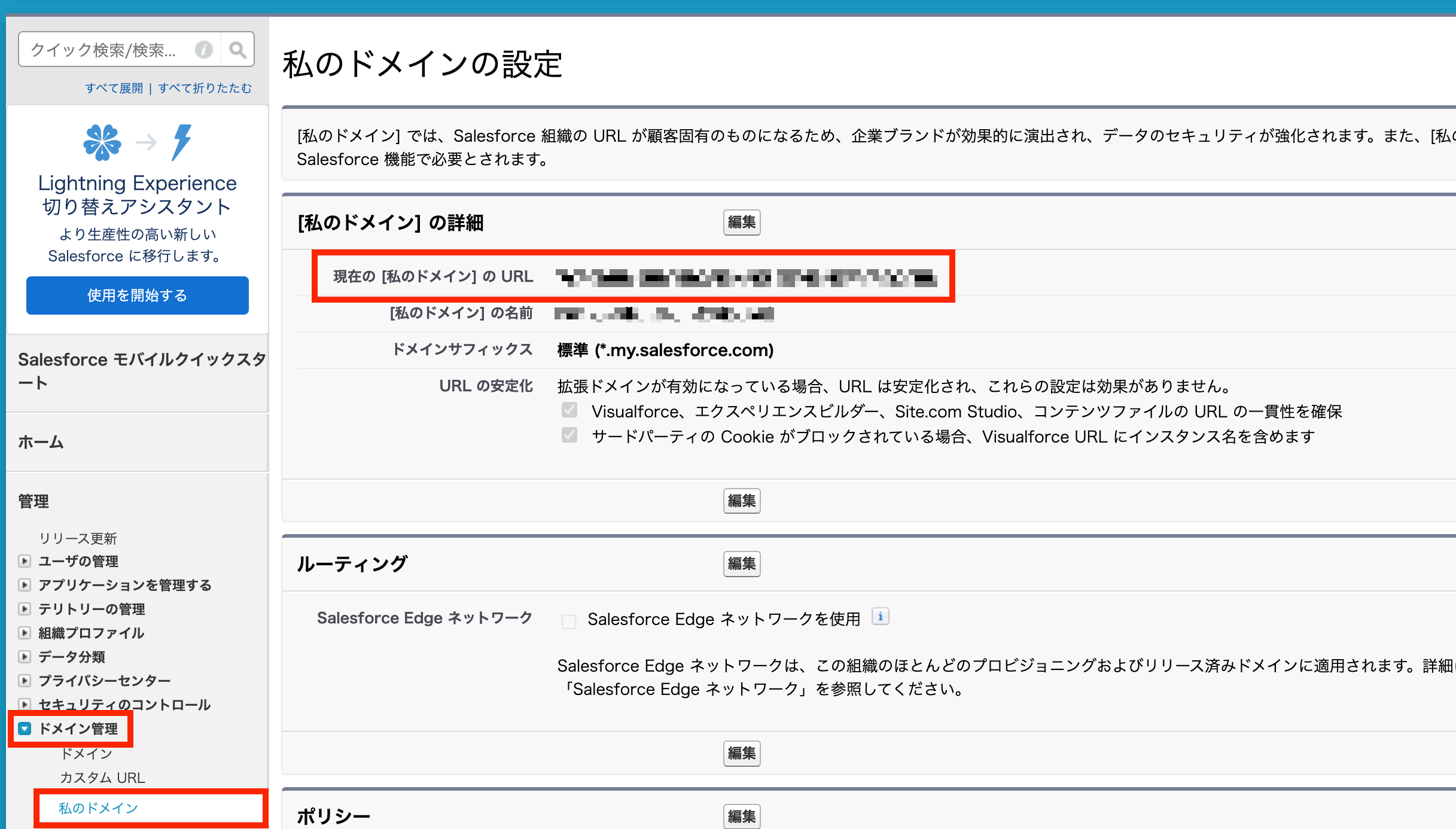 SalesForceにログインし、左メニューから『ドメイン管理 > 私のドメイン』を選択
