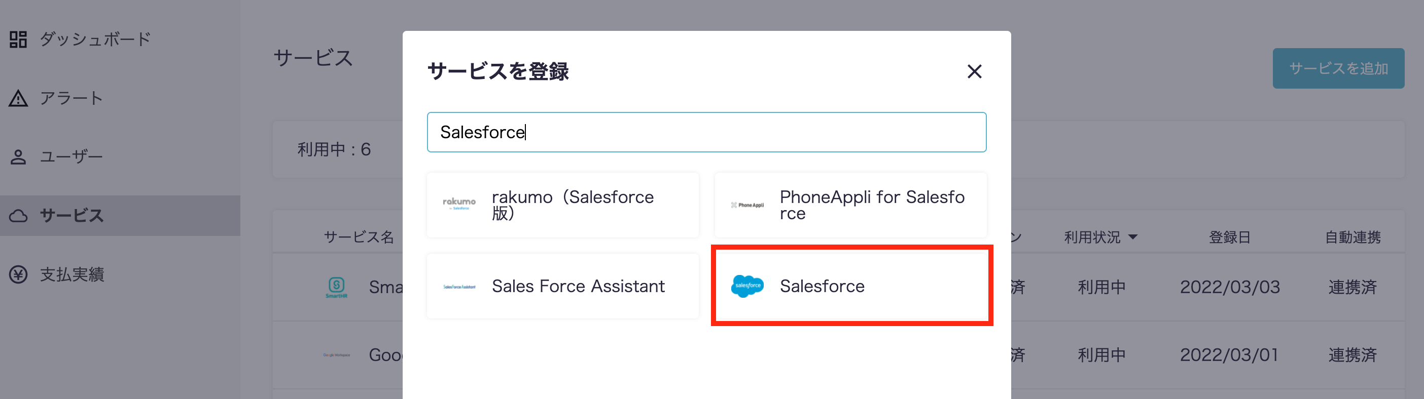 その後、下画像のようなモーダルが出現しますので、入力欄にサービス名である「Salesforce」と入力します。