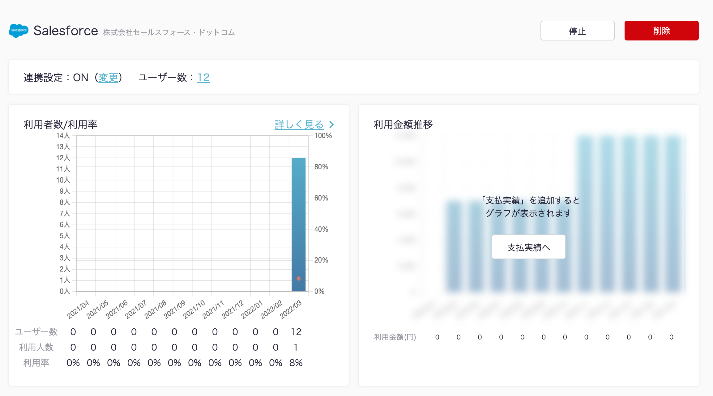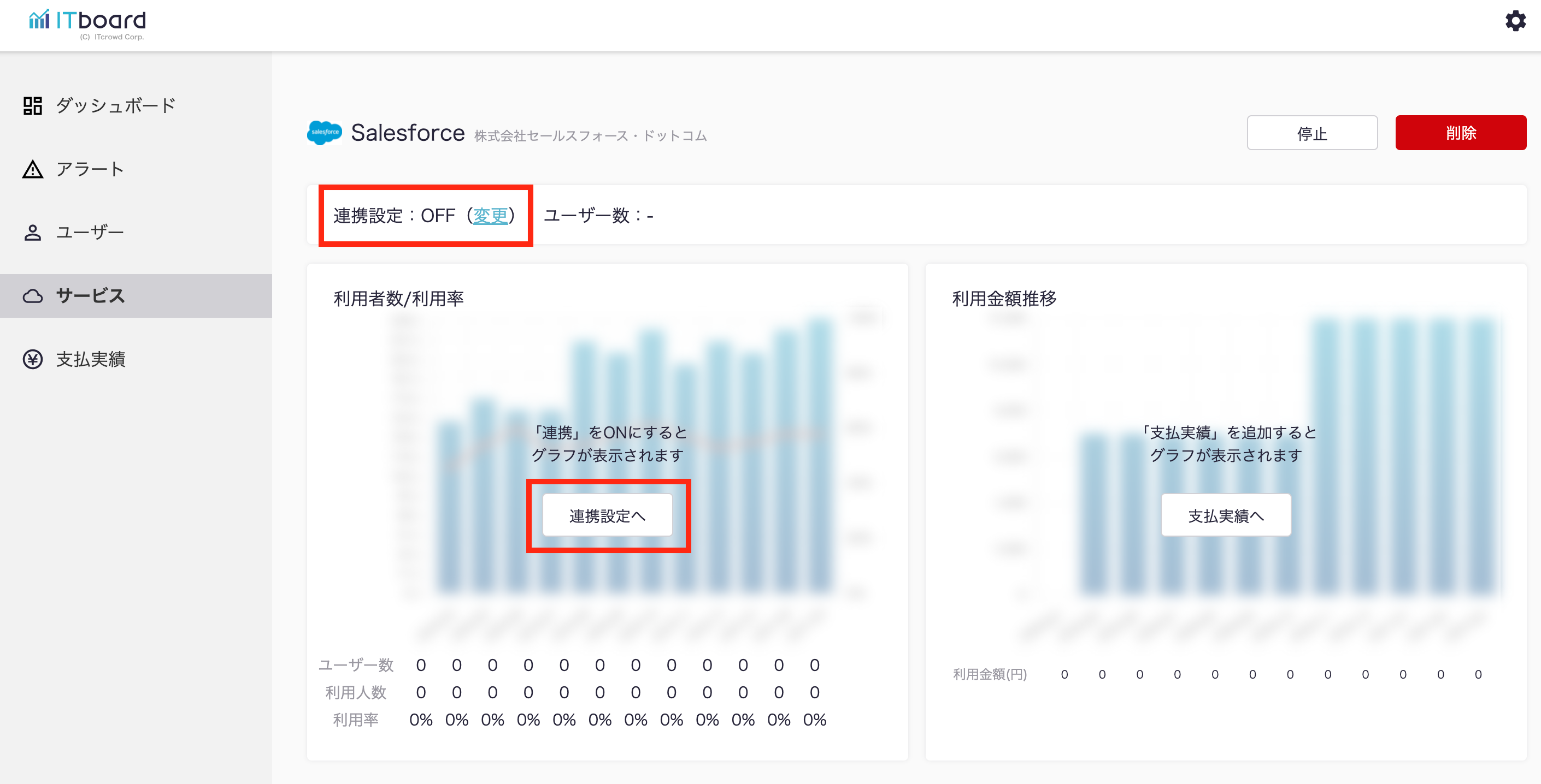 ITboardのサービス詳細画面に戻りますので、そこで「連携設定: ON」になり、「利用者数/利用率」のグラフが見られるようになっていれば、連携成功です。