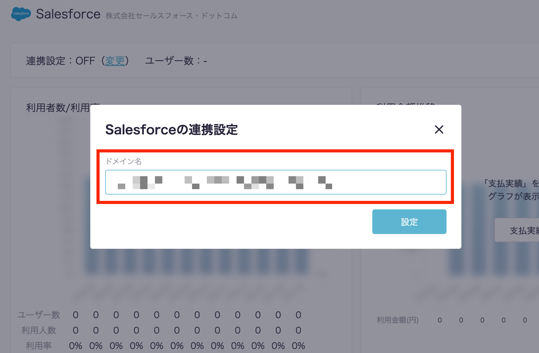 Salesforceの連携設定モーダルが出現するので、入力欄に手順1で確認した『現在の[私のドメイン]のURL』を入力し、『設定』ボタンを押下します。