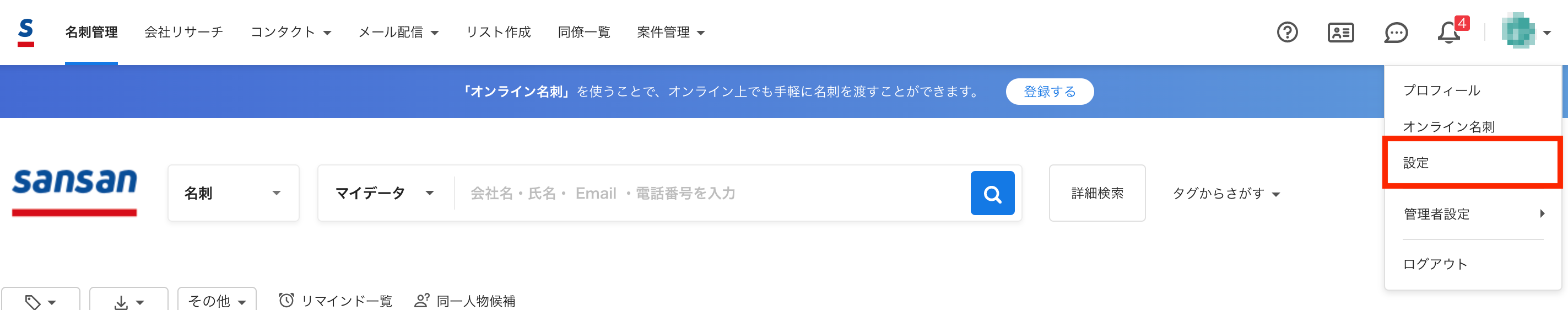 2.Sansanのヘッダーリンクから『設定』を選択する