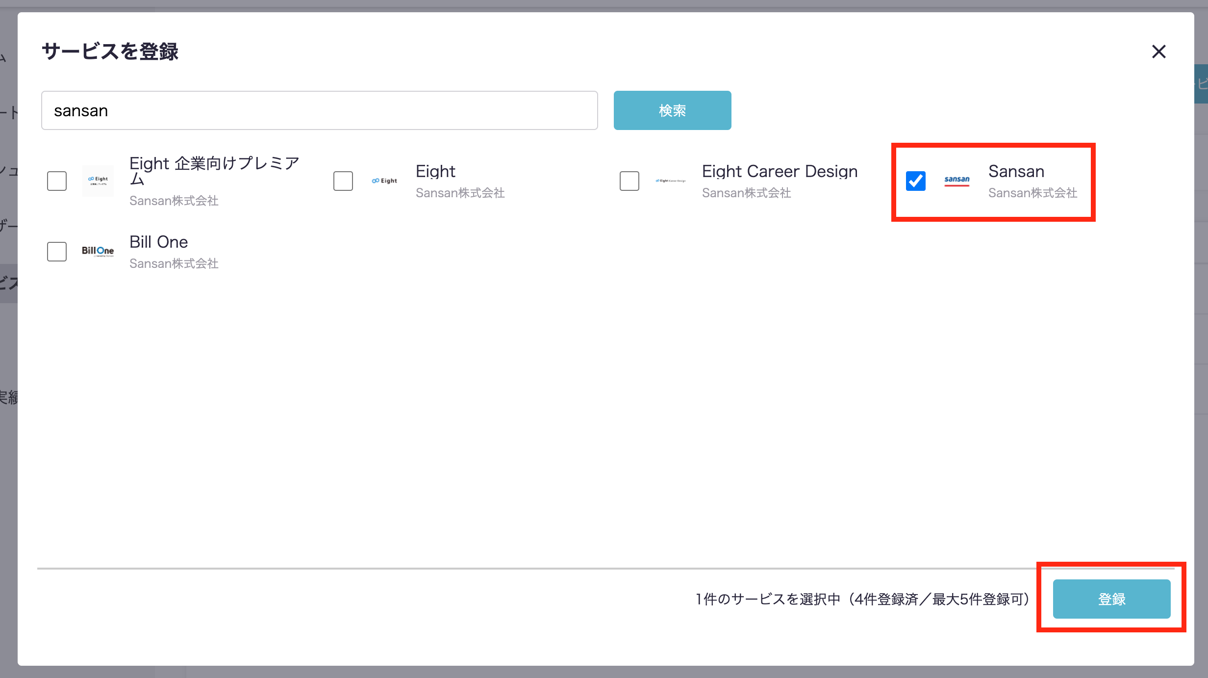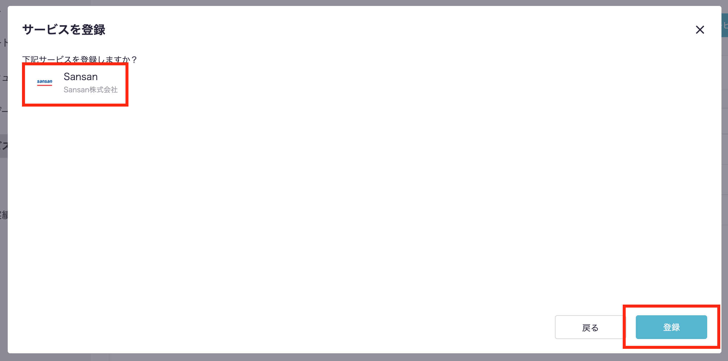 その後、下画像のようなモーダルが出現しますので、入力欄にサービス名である「sansan」と入力します。