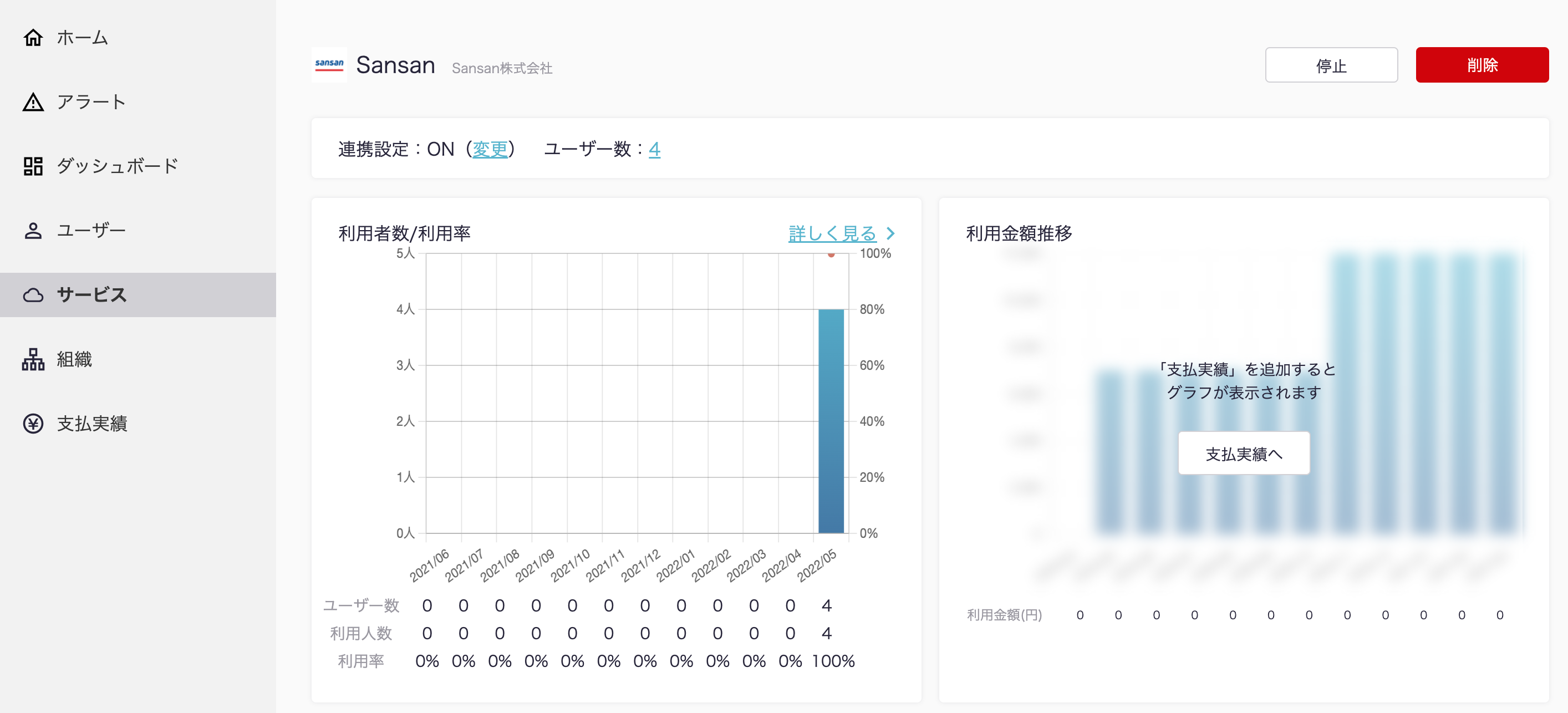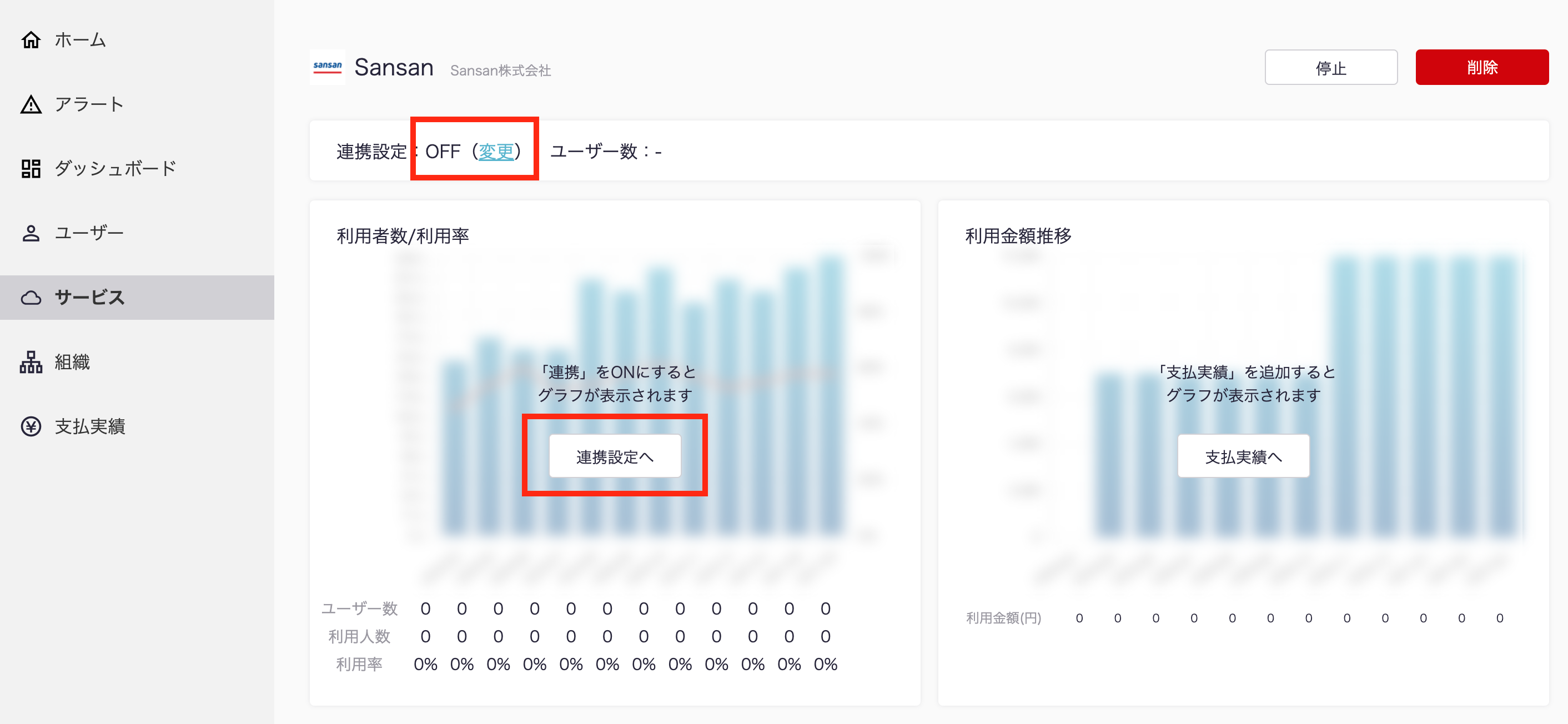 ITboardのサービス詳細画面に戻りますので、そこで「連携設定: ON」になり、「利用者数/利用率」のグラフが見られるようになっていれば、連携成功です。