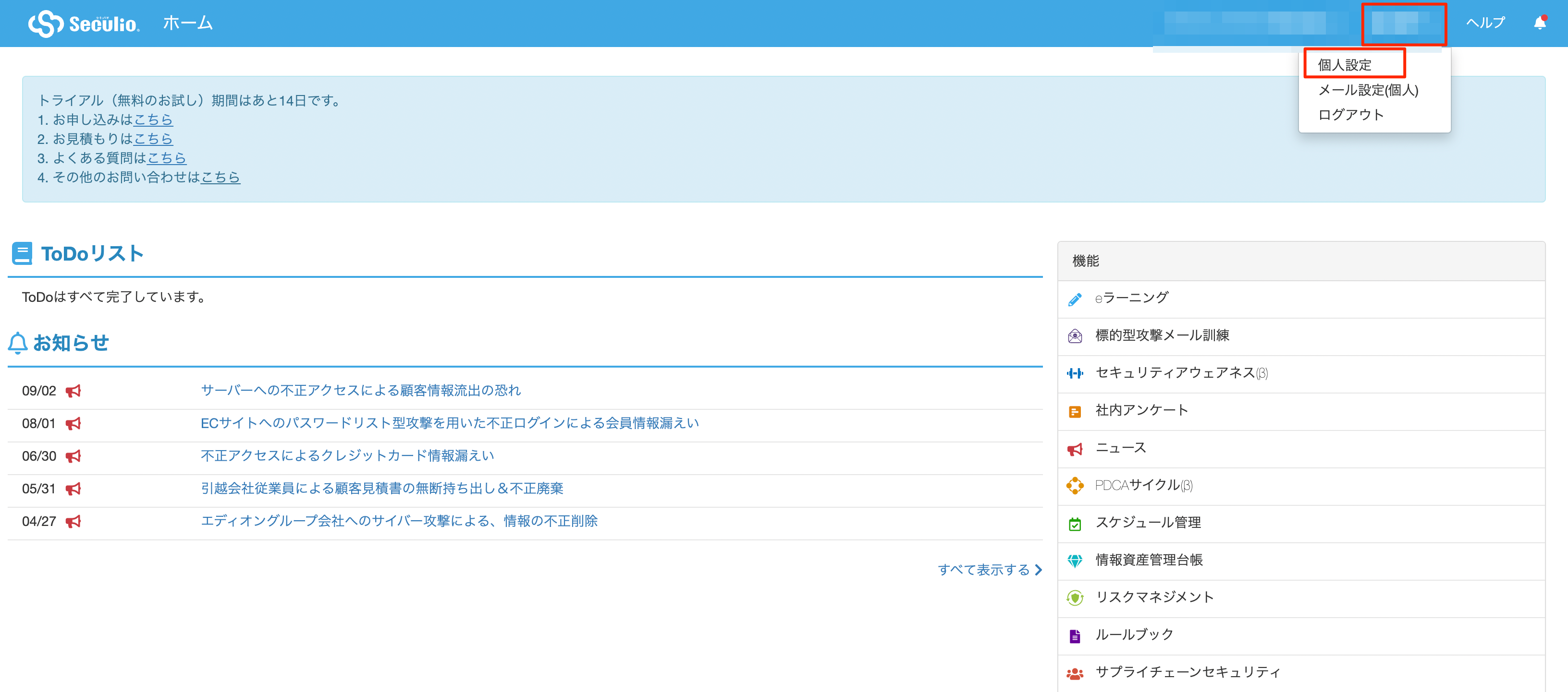 右上の『ユーザ名』を選択し、『個人設定』を押下します。