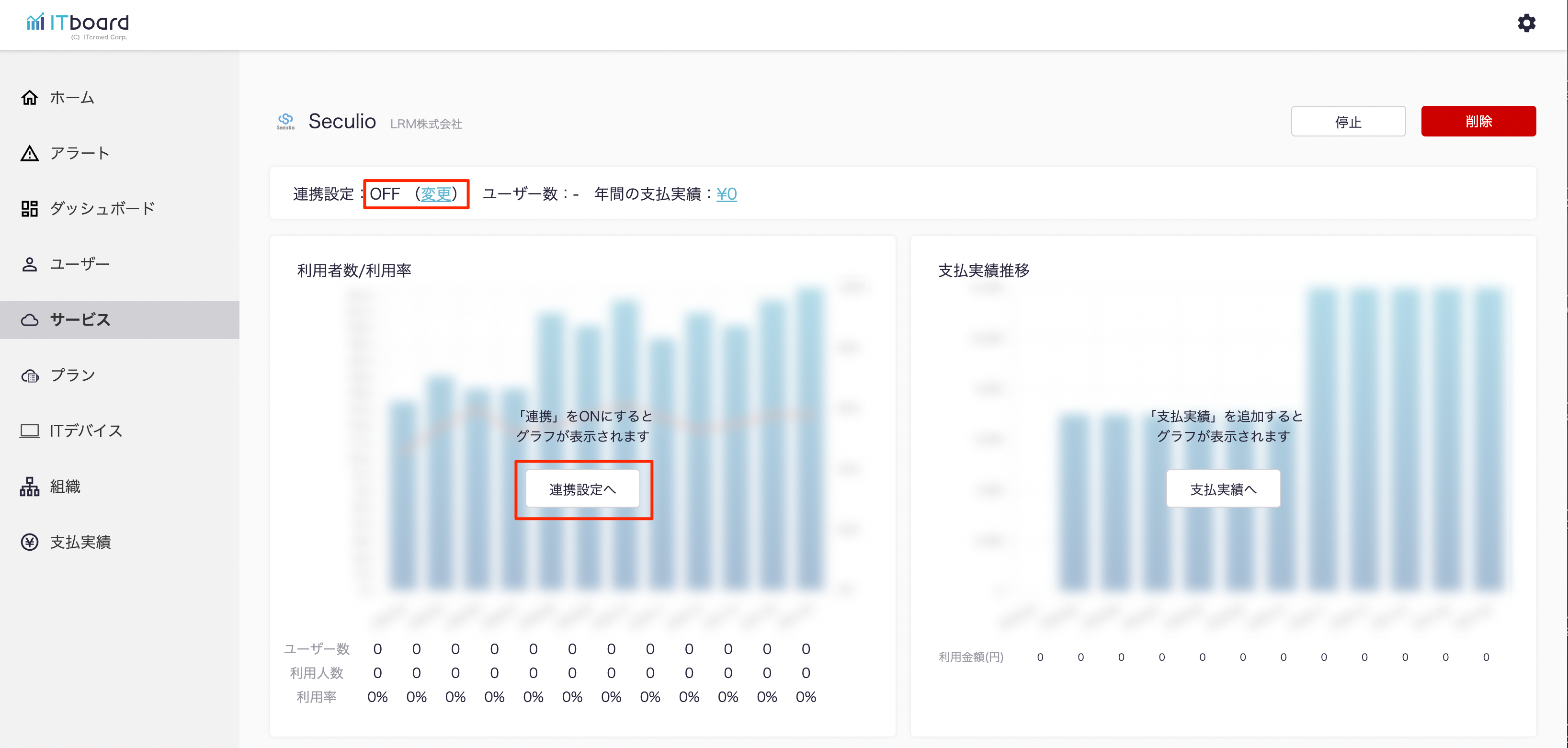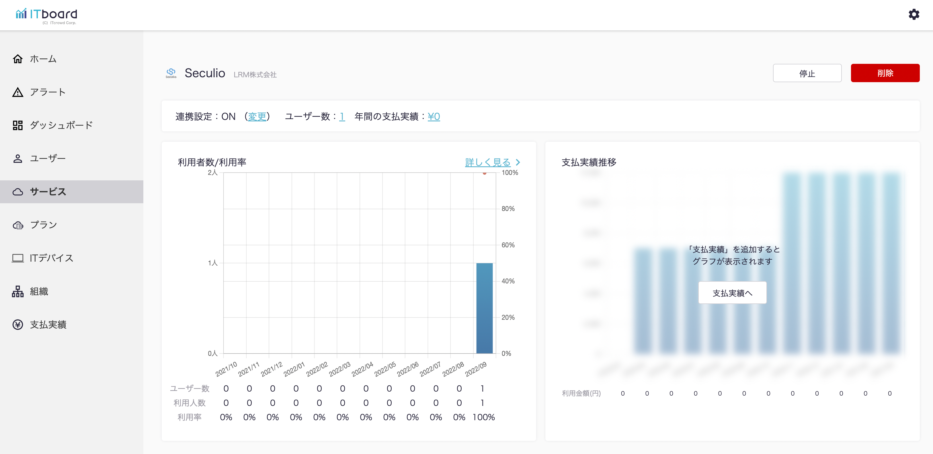 ITboardのサービス詳細画面に戻りますので、そこで「連携設定: ON」になり、「利用者数/利用率」のグラフが見られるようになっていれば、連携成功です。