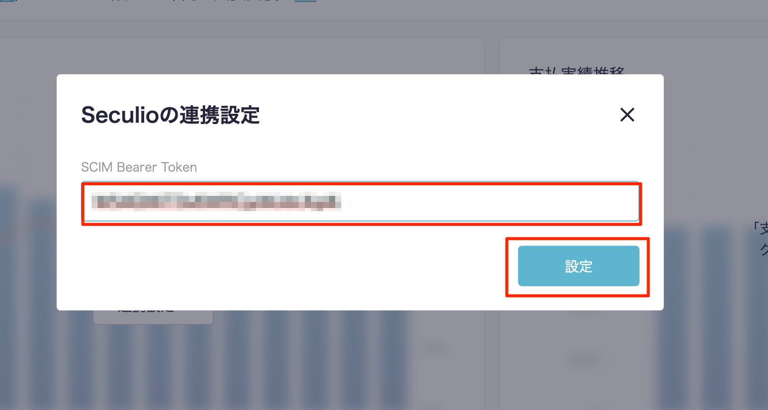 Seculioの連携設定モーダルが出現するので、「SCIM Bearer Token」を入力し『設定』ボタンを押下します。