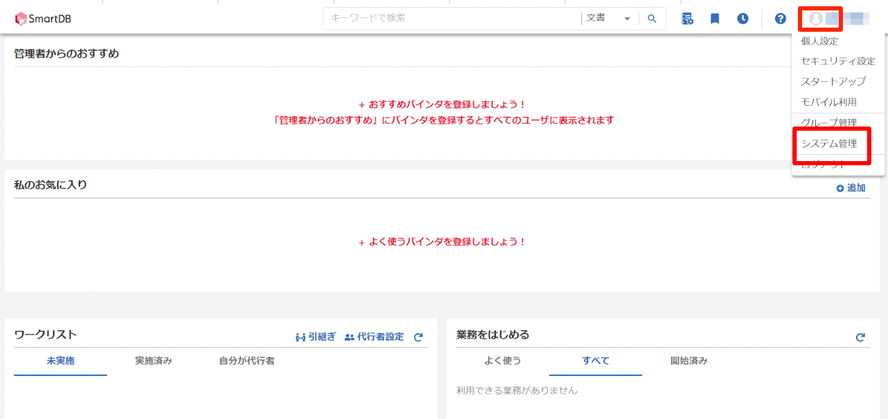 ヘッダの『ユーザアイコン』を選択し、『システム管理』を押下します。