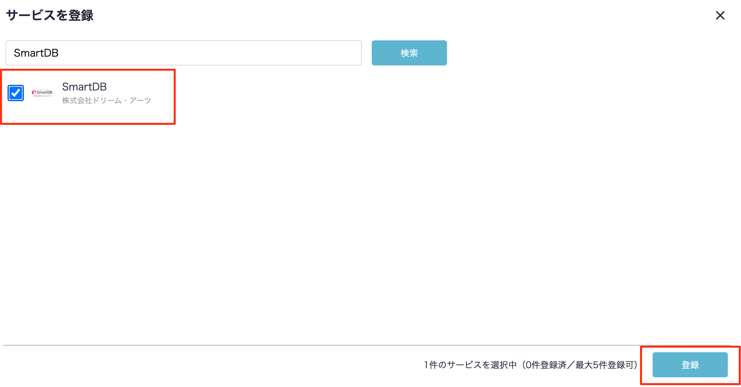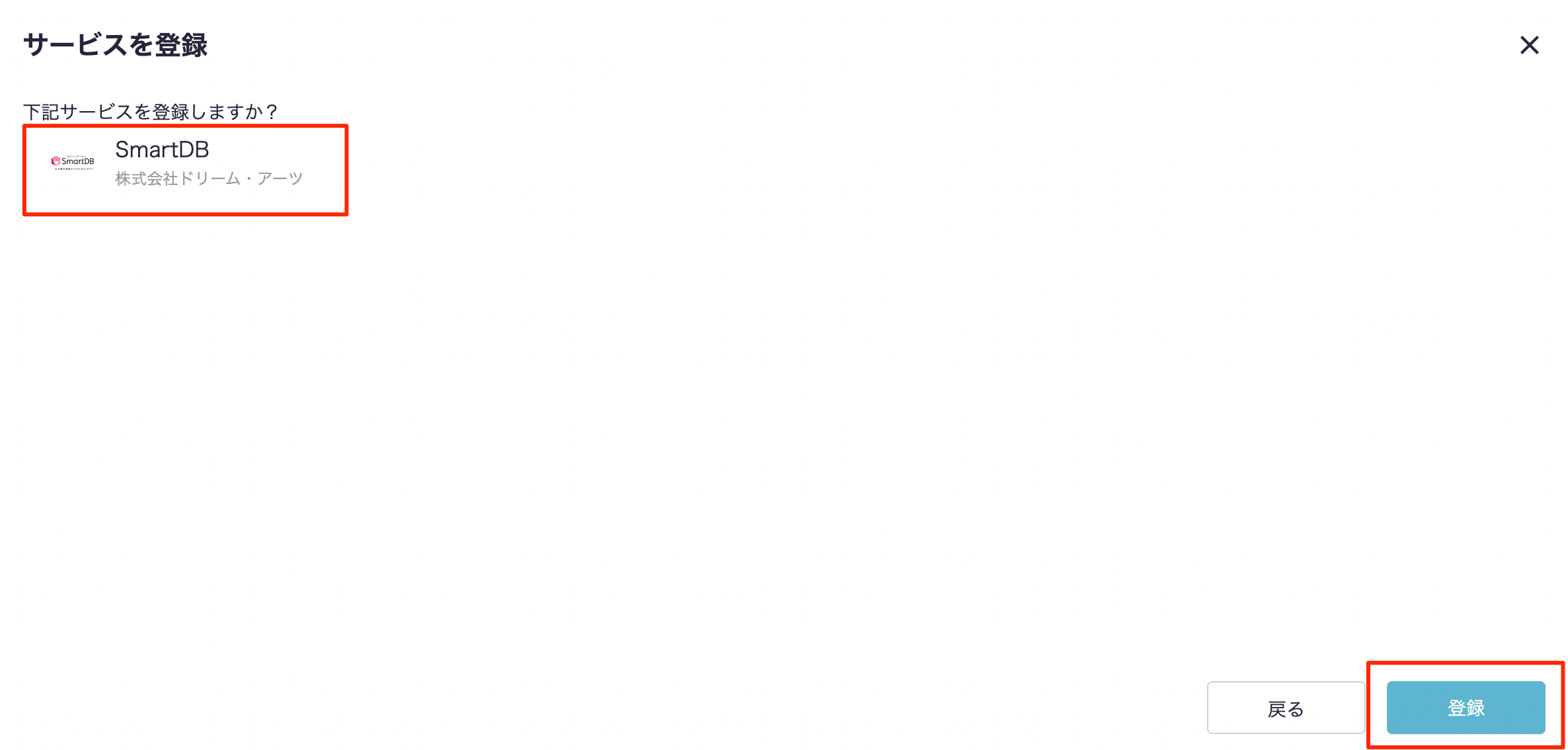 その後、下画像のようなモーダルが出現しますので、入力欄にサービス名である「SmartDB」と入力します。