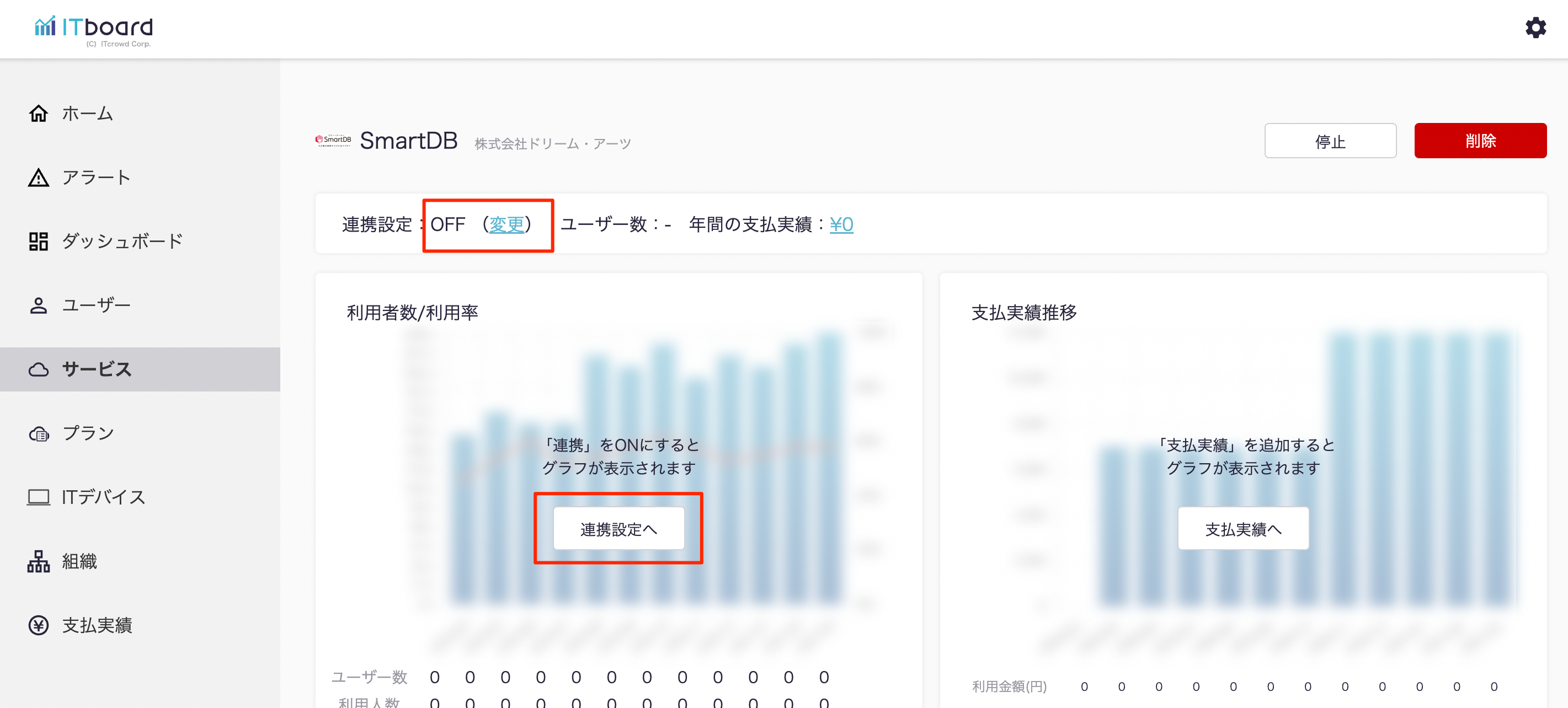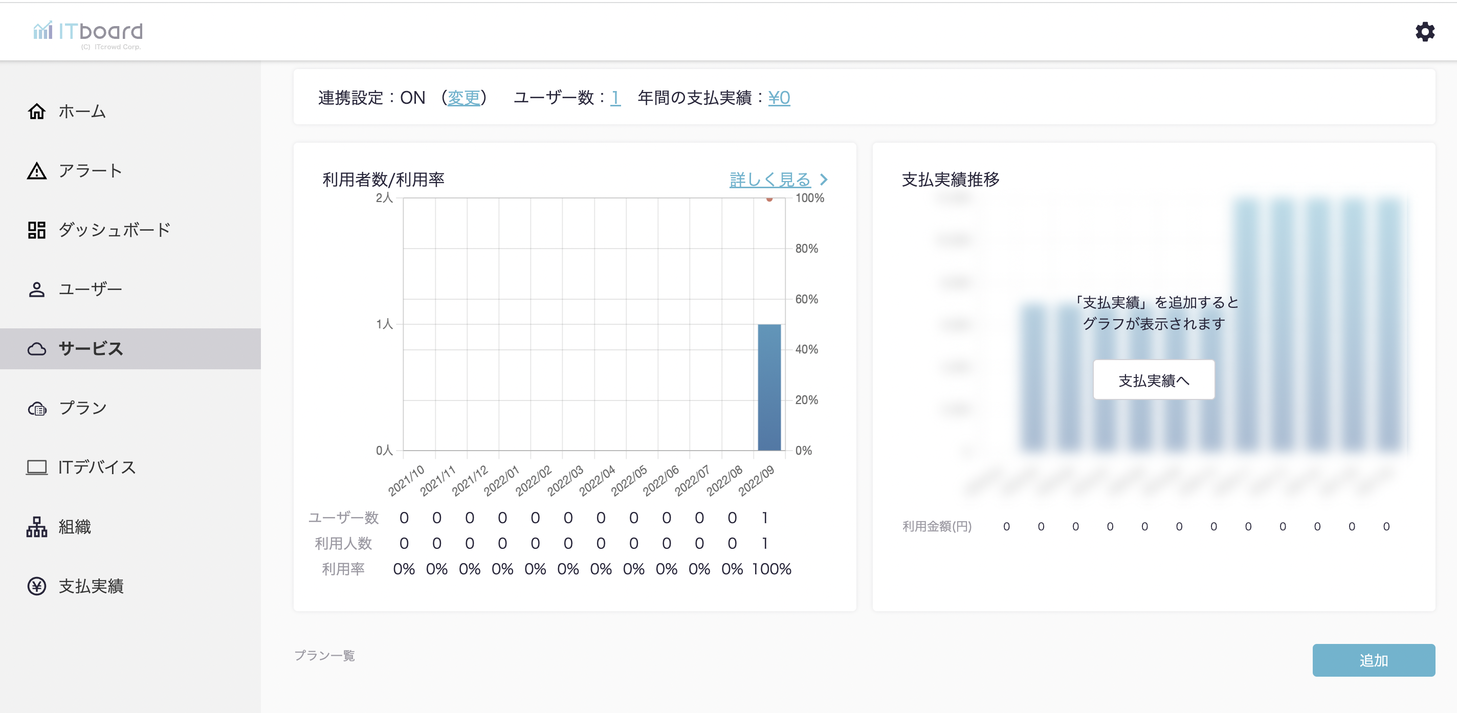 ITboardのサービス詳細画面に戻りますので、そこで「連携設定: ON」になり、「利用者数/利用率」のグラフが見られるようになっていれば、連携成功です。
