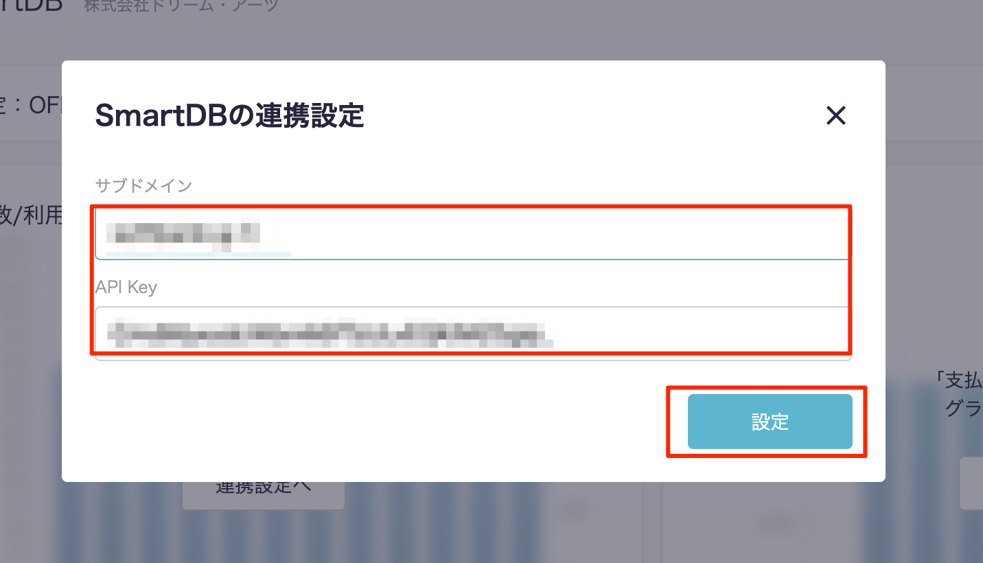 SmartDBの連携設定モーダルが出現するので、サブドメインとAPI Keyを入力し『設定』ボタンを押下します。