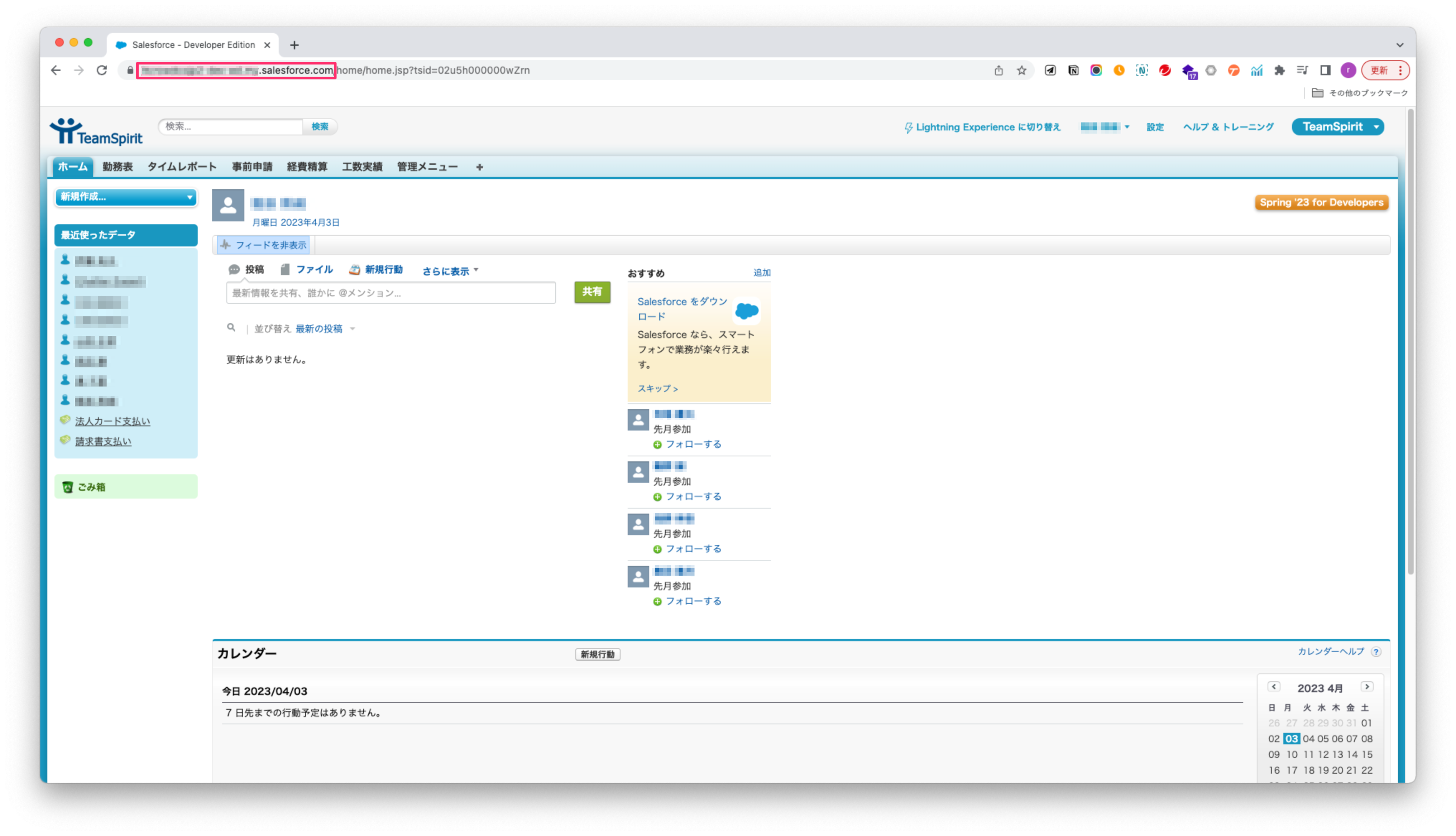 1. TeamSpirit の管理者権限を持ったアカウントでログインします