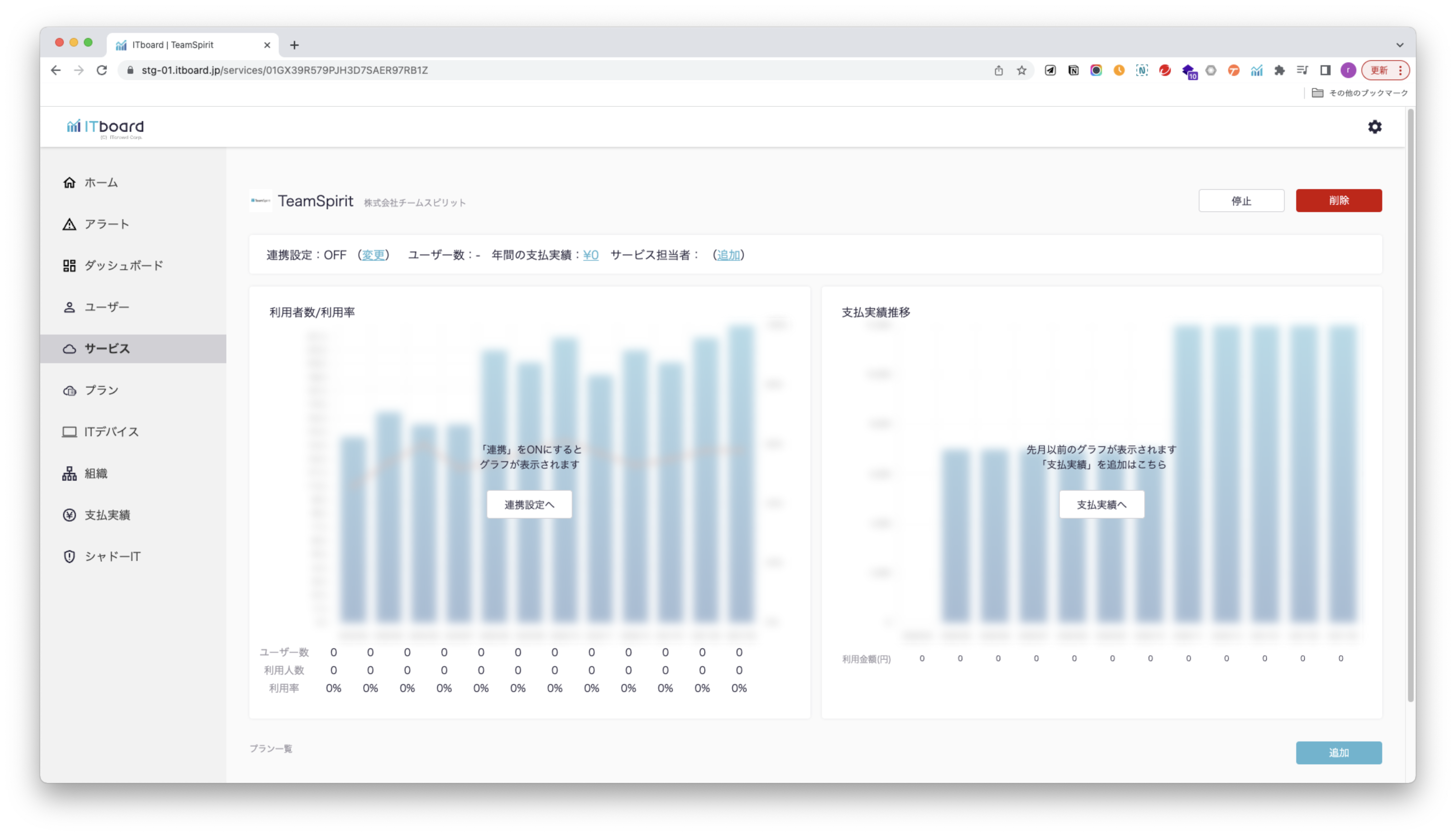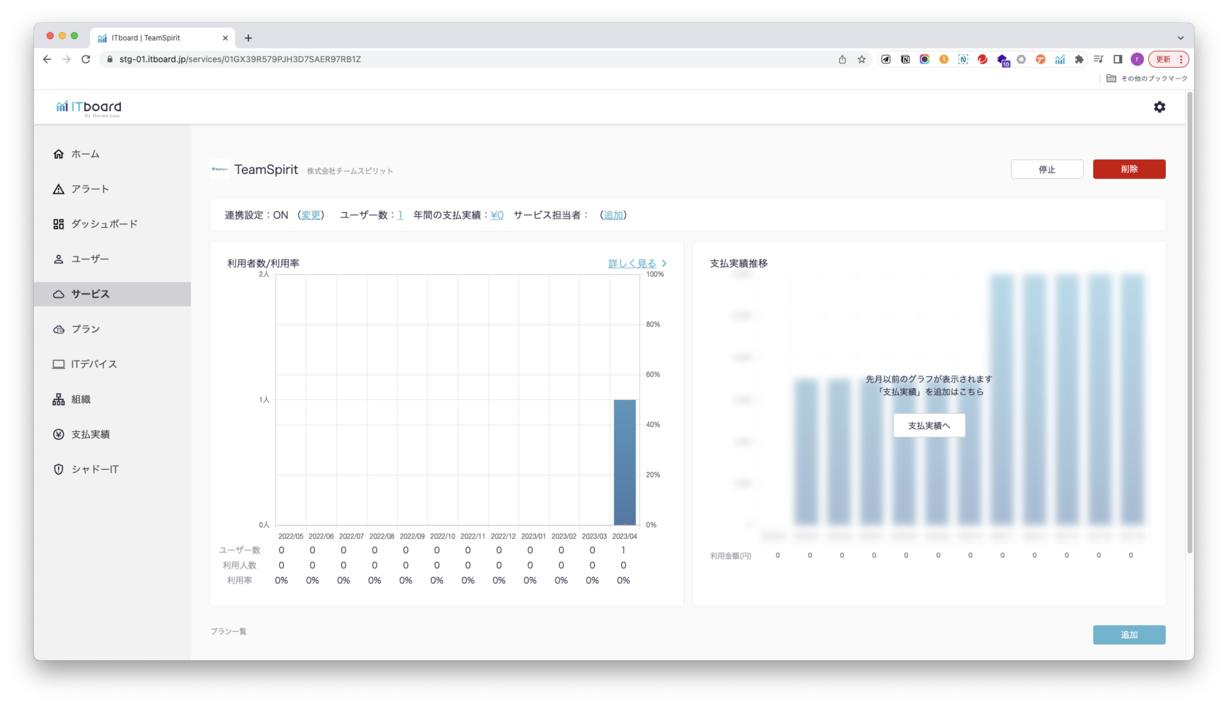 ITboardのサービス詳細画面に戻りますので、そこで「連携設定: ON」になり、「利用者数/利用率」のグラフが見られるようになっていれば、連携成功です。
