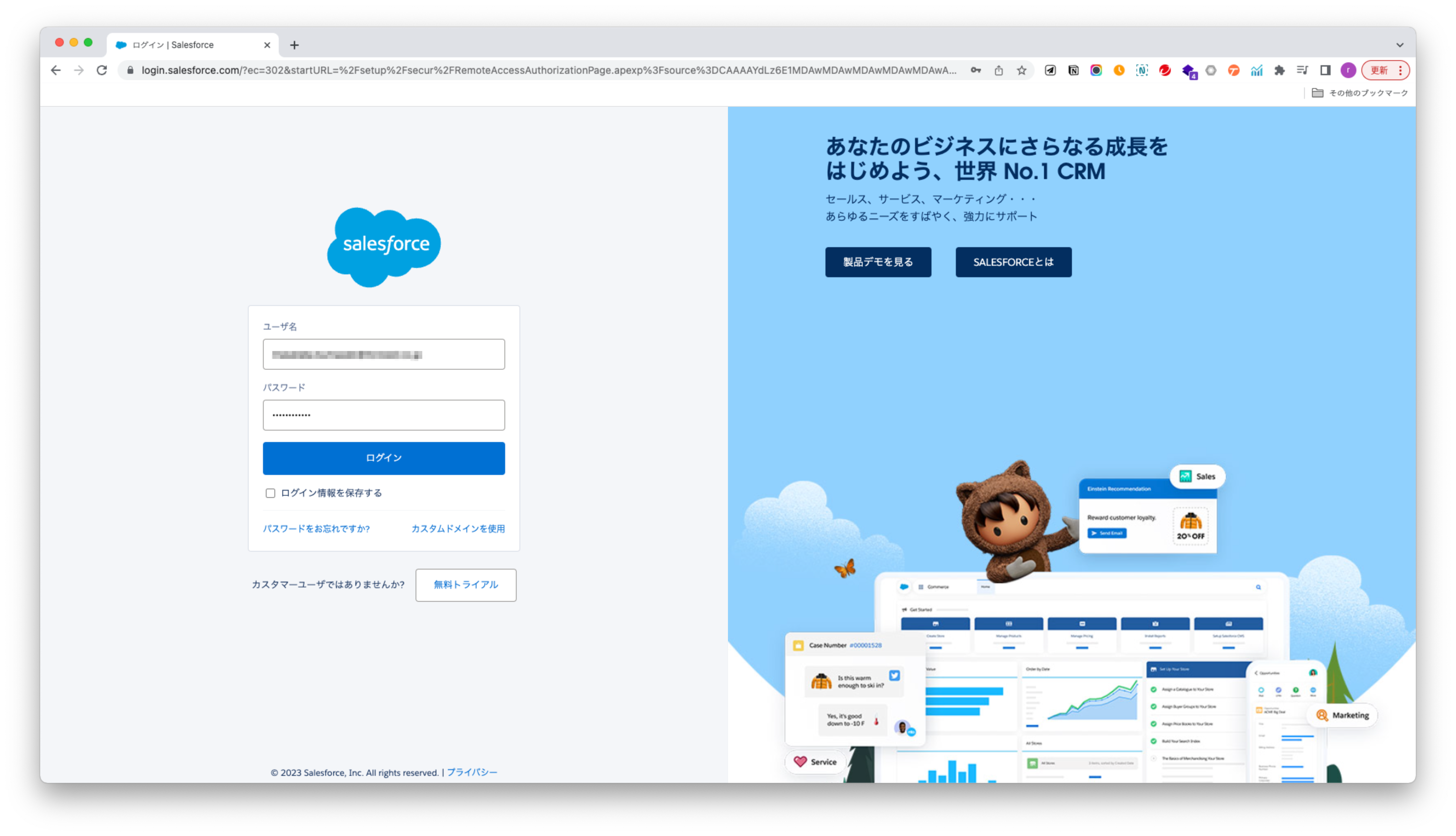 TeamSpirit(Salesforce)のログイン画面(https://login.salesforce.com/?locale=jp)からサインインします。
