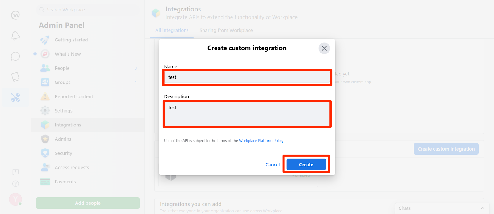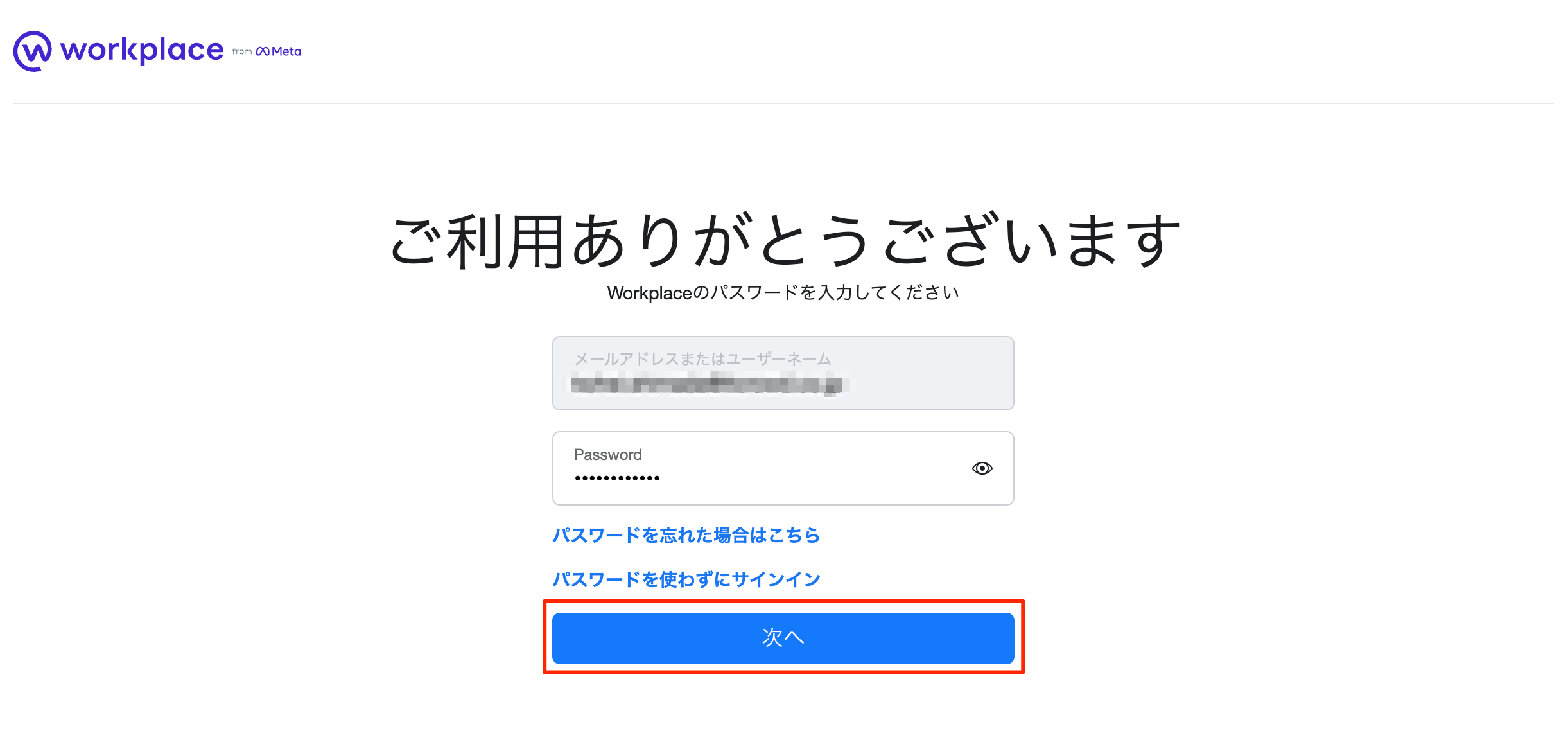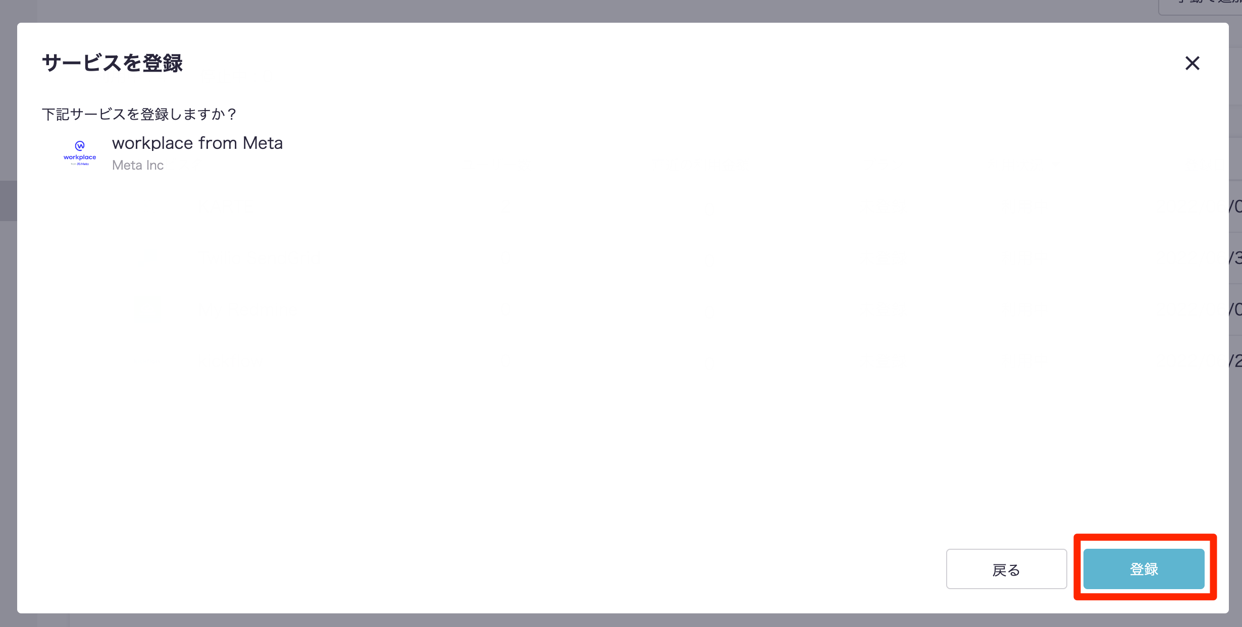 その後、下画像のようなモーダルが出現しますので、入力欄にサービス名である「workplace from Meta」と入力します。